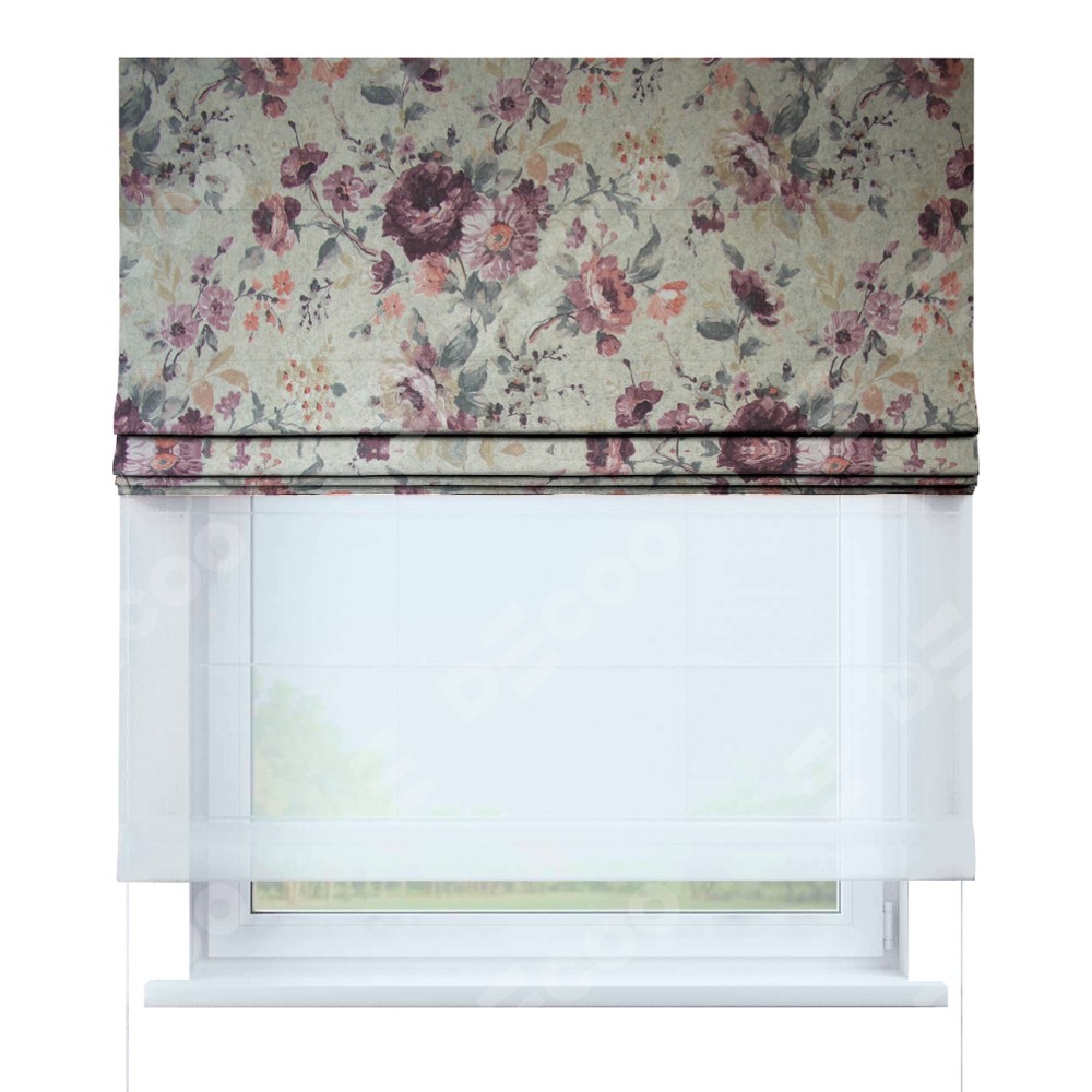 Римская штора день-ночь производителя «Cortin», используется для проёма, пошита из двух полотен, с лицевой стороны «Пионы», вторая ткань тюль (по стандарту комплектуется тюль белого цвета артикул V-01). Имеет универсальный механизм и подходит для монтажа: на потолок, на стену и в нишу.