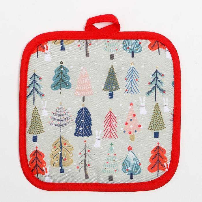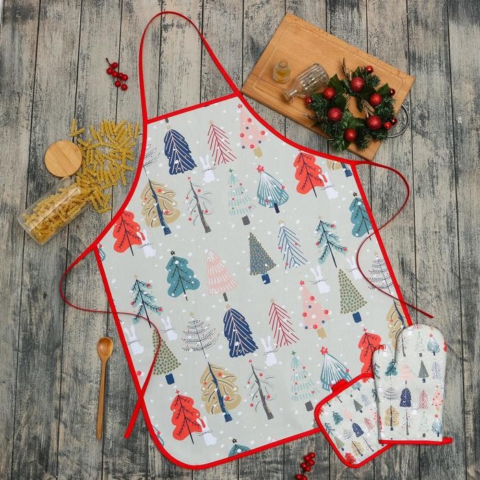 Кухонный новогодний набор Доляна«Новогодний лес» фартук 70х80см, прихватка 17х17см, варежка-прихватка 26х16см