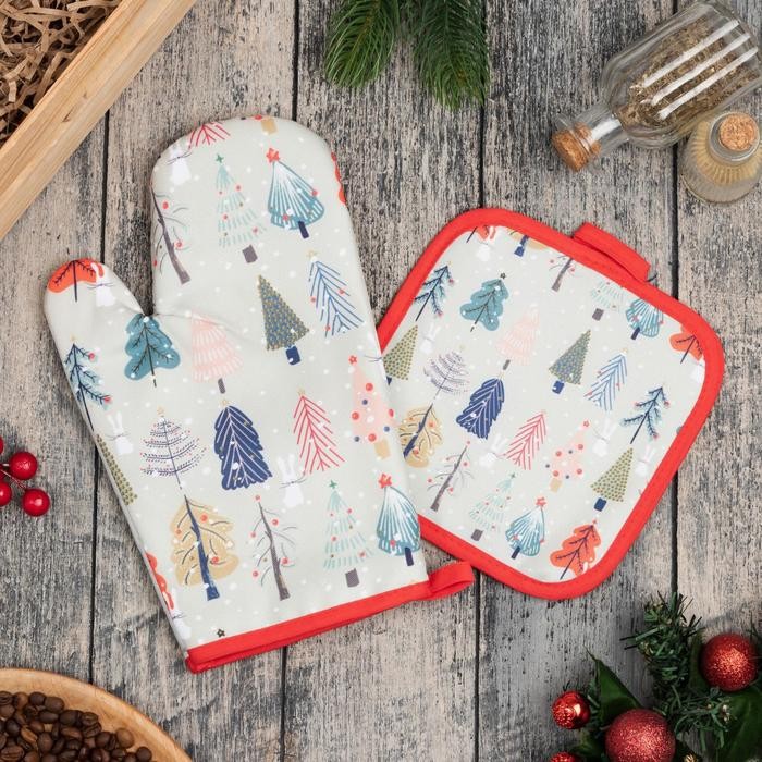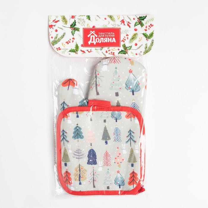 Кухонный новогодний набор Доляна «Новогодний лес», прихватка 17х17см, варежка-прихватка 26×16 см,100% п/э