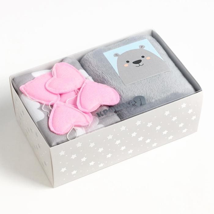 В набор входит плед 90 × 90 см и муслиновая пелёнка 75 × 120 см.