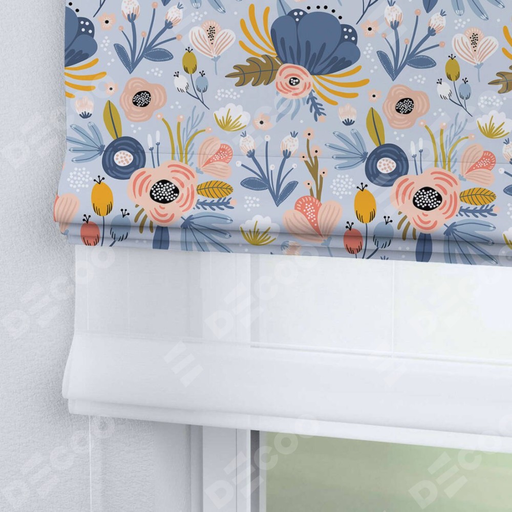 Римская штора день-ночь производителя «Cortin», используется для проёма, пошита из двух полотен, с лицевой блэкаут с нанесением сублимационной печати «Волшебные цветы», вторая ткань тюль (по стандарту комплектуется тюль белого цвета артикул V-01). Имеет универсальный механизм и подходит для монтажа: на потолок, на стену и в нишу.