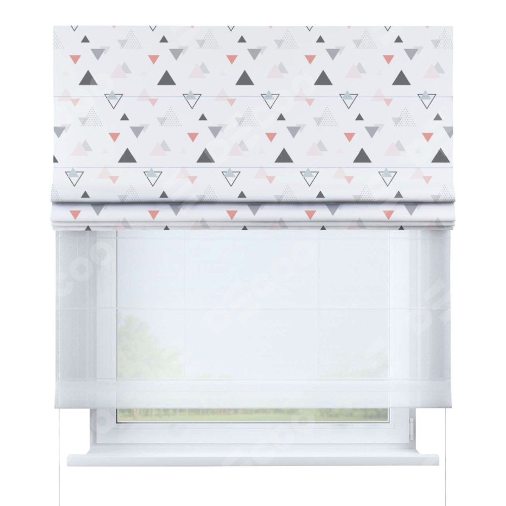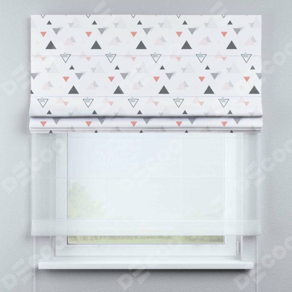 Римская штора день-ночь производителя «Cortin», используется для проёма, пошита из двух полотен, с лицевой блэкаут с нанесением сублимационной печати «Дождь из треугольников», вторая ткань тюль (по стандарту комплектуется тюль белого цвета артикул V-01). Имеет универсальный механизм и подходит для монтажа: на потолок, на стену и в нишу.