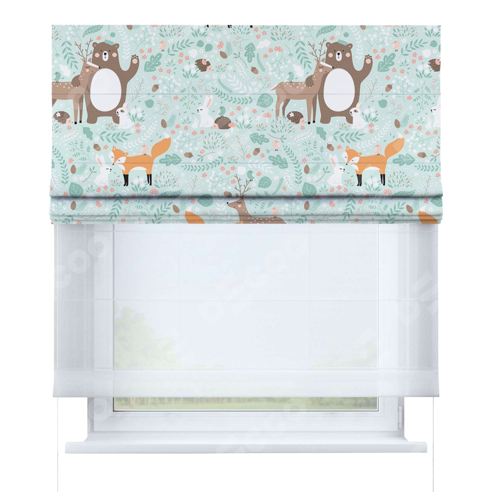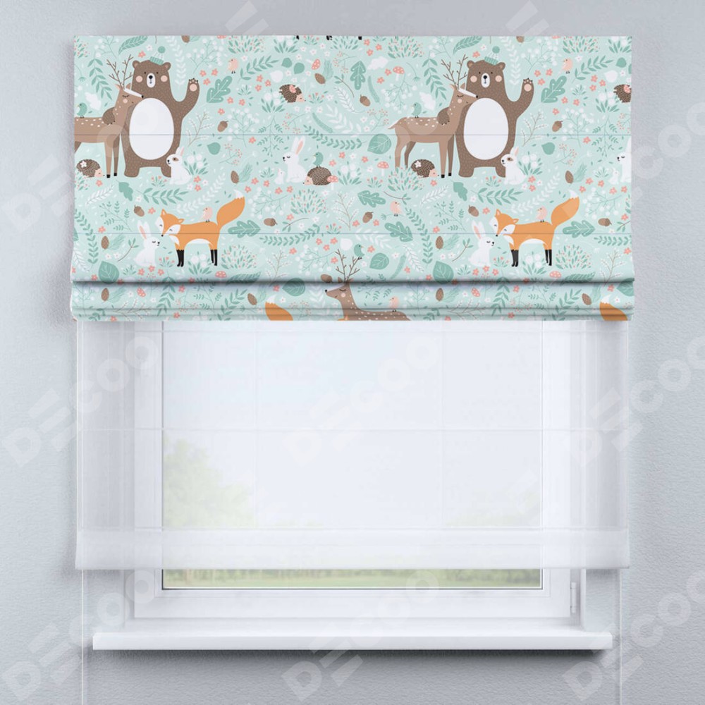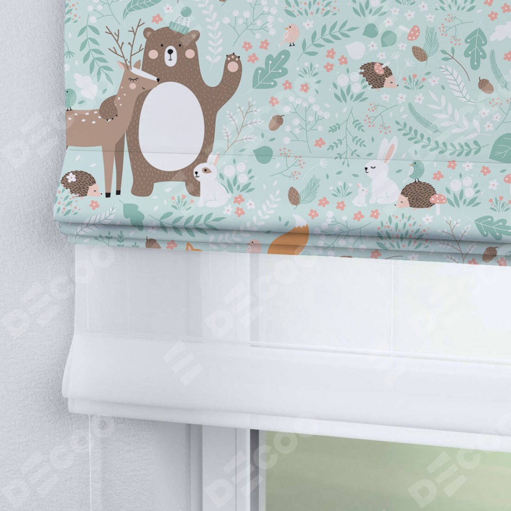 Римская штора день-ночь производителя «Cortin», используется для проёма, пошита из двух полотен, с лицевой блэкаут с нанесением сублимационной печати «Лесные друзья», вторая ткань тюль (по стандарту комплектуется тюль белого цвета артикул V-01). Имеет универсальный механизм и подходит для монтажа: на потолок, на стену и в нишу.