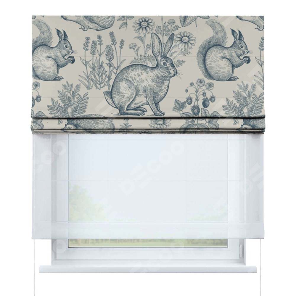 Римская штора день-ночь производителя «Cortin», используется для проёма, пошита из двух полотен, с лицевой блэкаут с нанесением сублимационной печати «На лугу», вторая ткань тюль (по стандарту комплектуется тюль белого цвета артикул V-01). Имеет универсальный механизм и подходит для монтажа: на потолок, на стену и в нишу.
