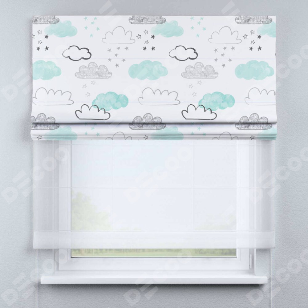 Римская штора день-ночь производителя «Cortin», используется для проёма, пошита из двух полотен, с лицевой блэкаут с нанесением сублимационной печати «Облака и звёзды», вторая ткань тюль (по стандарту комплектуется тюль белого цвета артикул V-01). Имеет универсальный механизм и подходит для монтажа: на потолок, на стену и в нишу.