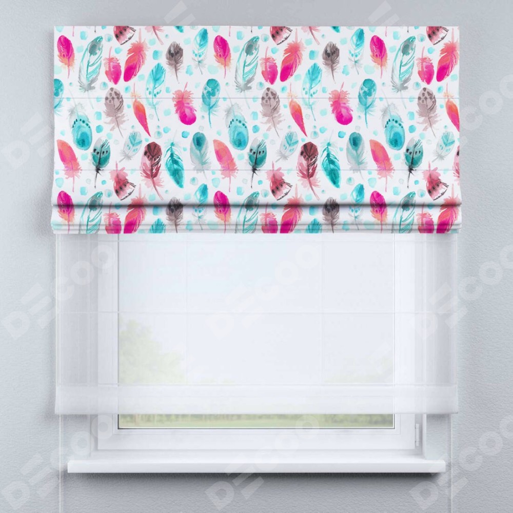 Римская штора день-ночь производителя «Cortin», используется для проёма, пошита из двух полотен, с лицевой блэкаут с нанесением сублимационной печати «Перья», вторая ткань тюль (по стандарту комплектуется тюль белого цвета артикул V-01). Имеет универсальный механизм и подходит для монтажа: на потолок, на стену и в нишу.