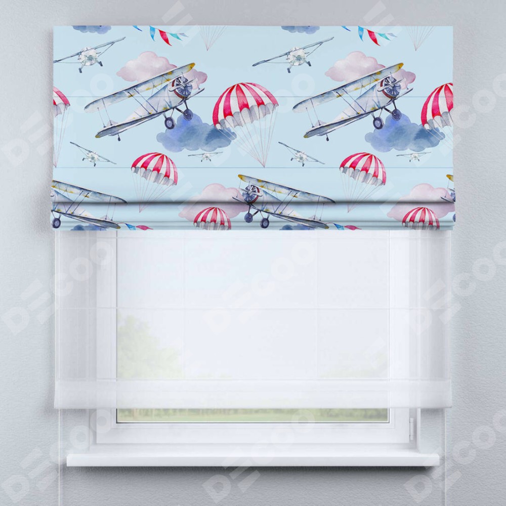 Римская штора день-ночь производителя «Cortin», используется для проёма, пошита из двух полотен, с лицевой блэкаут с нанесением сублимационной печати «Самолёт», вторая ткань тюль (по стандарту комплектуется тюль белого цвета артикул V-01). Имеет универсальный механизм и подходит для монтажа: на потолок, на стену и в нишу.