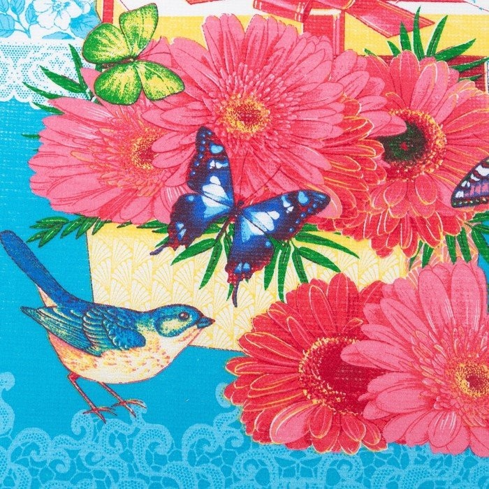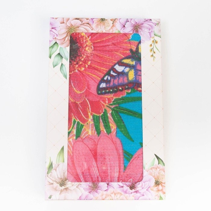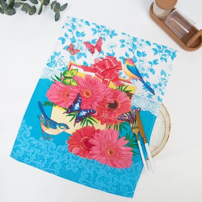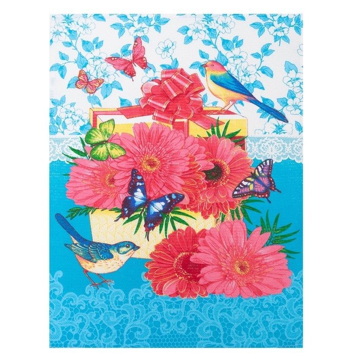 Полотенце в коробке 45×60 см, Герберы, бирюза, вафля, 160 гр/м2, хлопок 100%