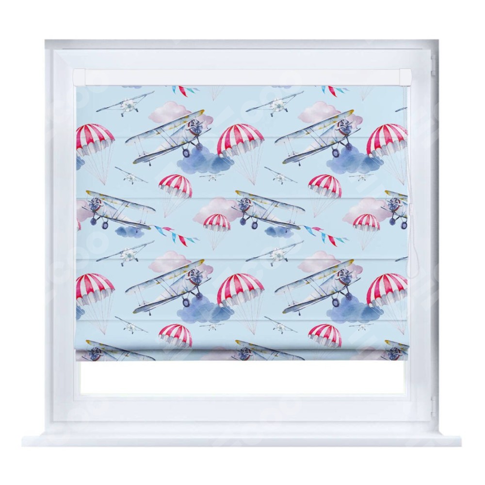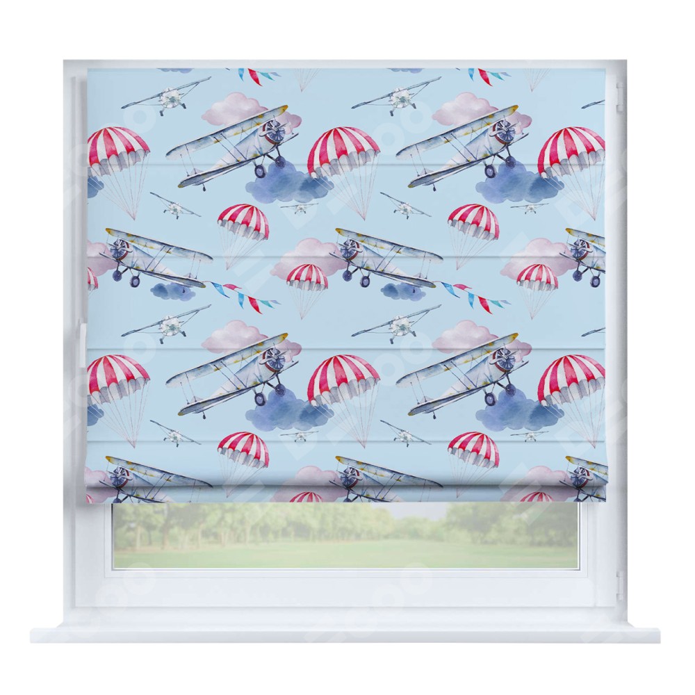 Римская штора производителя «Cortin», устанавливается на створку окна, пошита из ткани блэкаут с нанесением сублимационной печати «Самолёт». Штора шьётся по индивидуальным размерам, для данного типа римской шторы возможная ширина от 35 до 150 см., высота до 250 см.