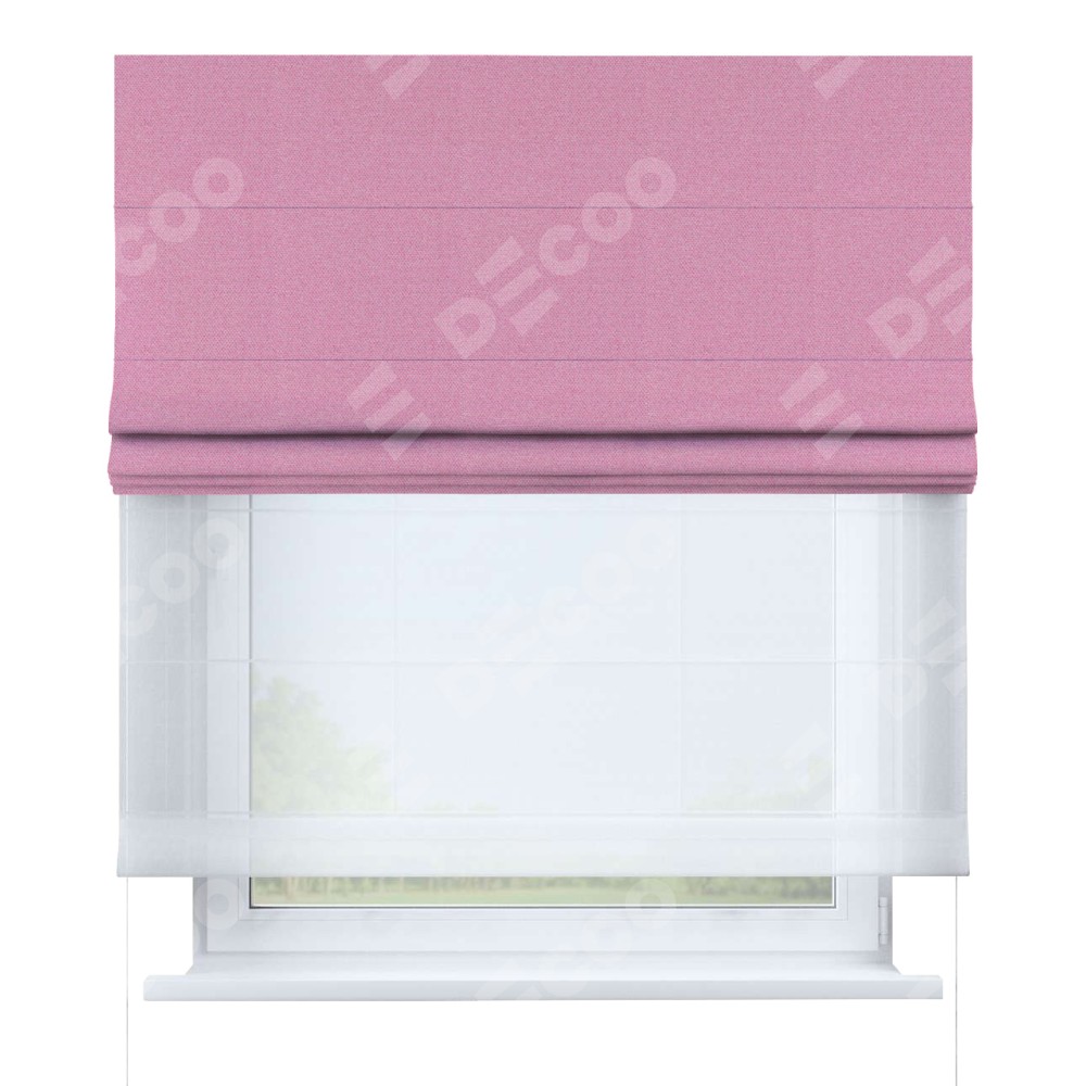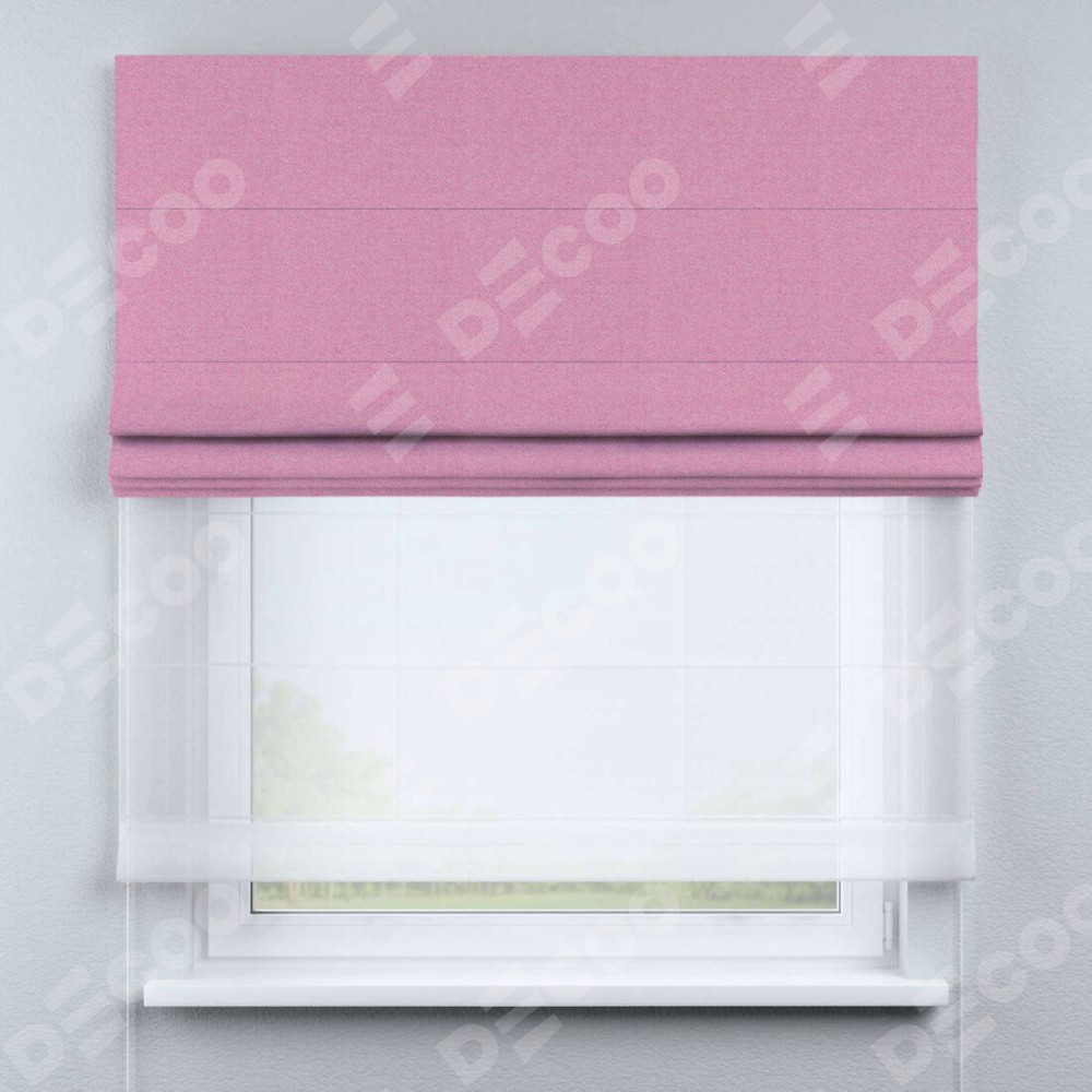 Римская штора день-ночь производителя «Cortin», используется для проёма, пошита из двух полотен, с лицевой стороны лён димаут розовый артикул 16257, вторая ткань тюль (по стандарту комплектуется тюль белого цвета артикул V-01). Имеет универсальный механизм и подходит для монтажа: на потолок, на стену и в нишу.