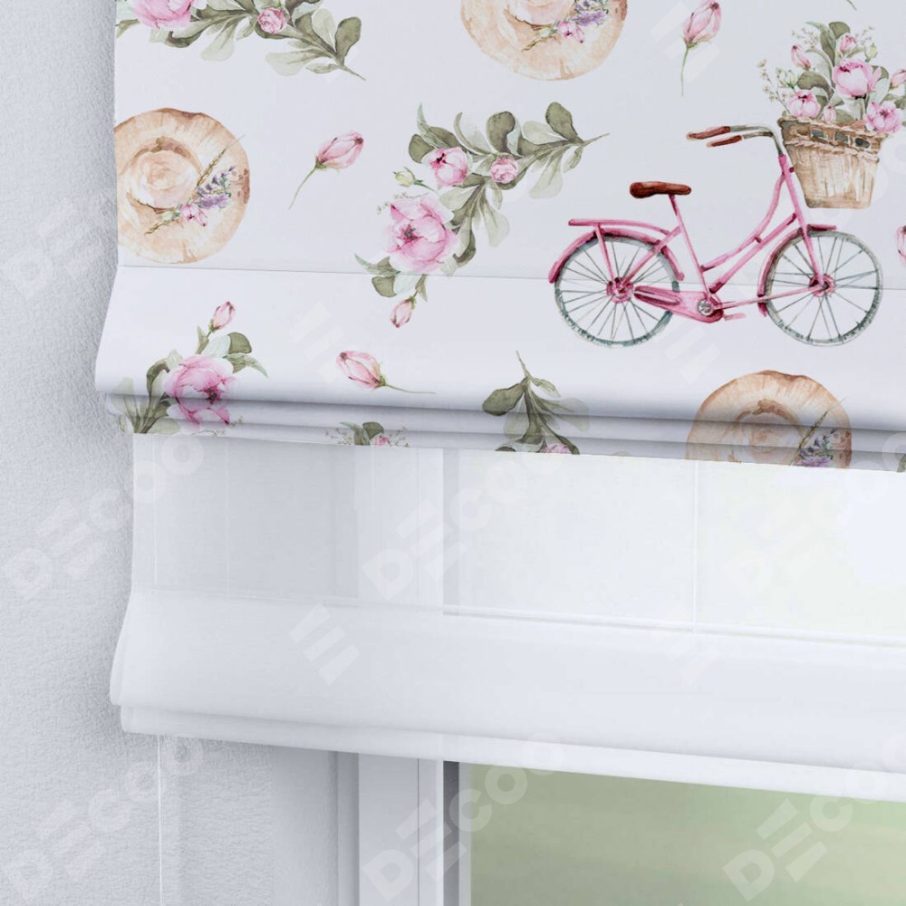 Римская штора день-ночь производителя «Cortin», используется для проёма, пошита из двух полотен, с лицевой блэкаут с нанесением сублимационной печати «Розовый велосипед», вторая ткань тюль (по стандарту комплектуется тюль белого цвета артикул V-01). Имеет универсальный механизм и подходит для монтажа: на потолок, на стену и в нишу.