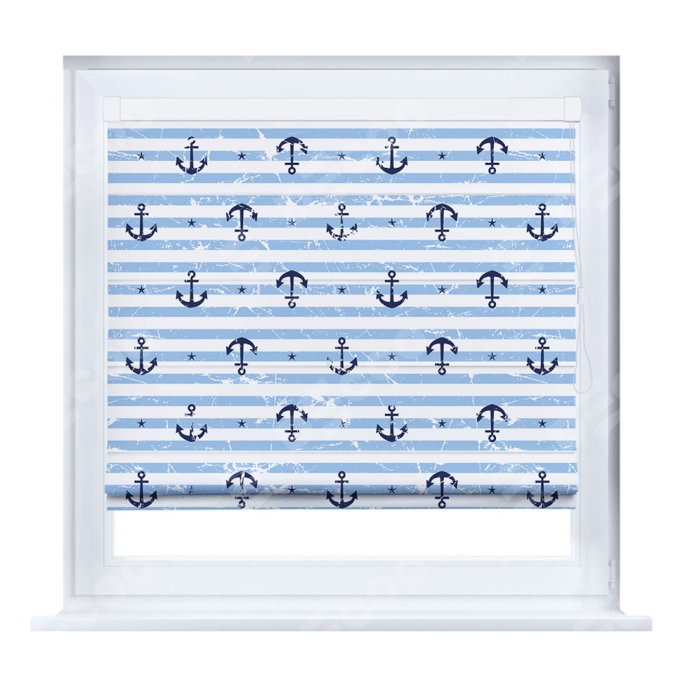 Римская штора кассетного типа, производителя «Cortin», устанавливается только на пластиковые окна и прилегает к стеклопакету, пошита из ткани блэкаут с нанесением сублимационной печати «Полоски и якори».