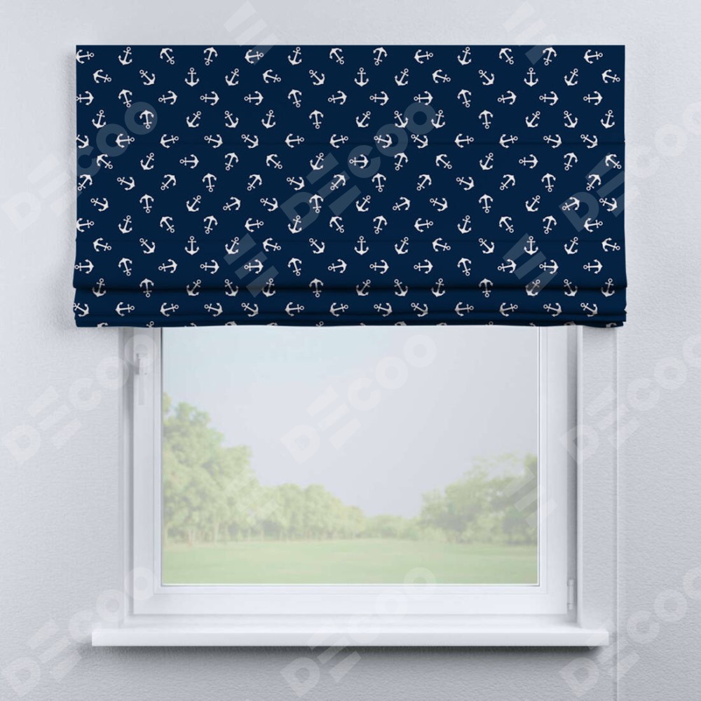 Римская штора производителя «Cortin», используется для проёма, пошита из ткани блэкаут с нанесением сублимационной печати «Морские якори». Имеет универсальный механизм и подходит для монтажа: на потолок, на стену и в нишу.