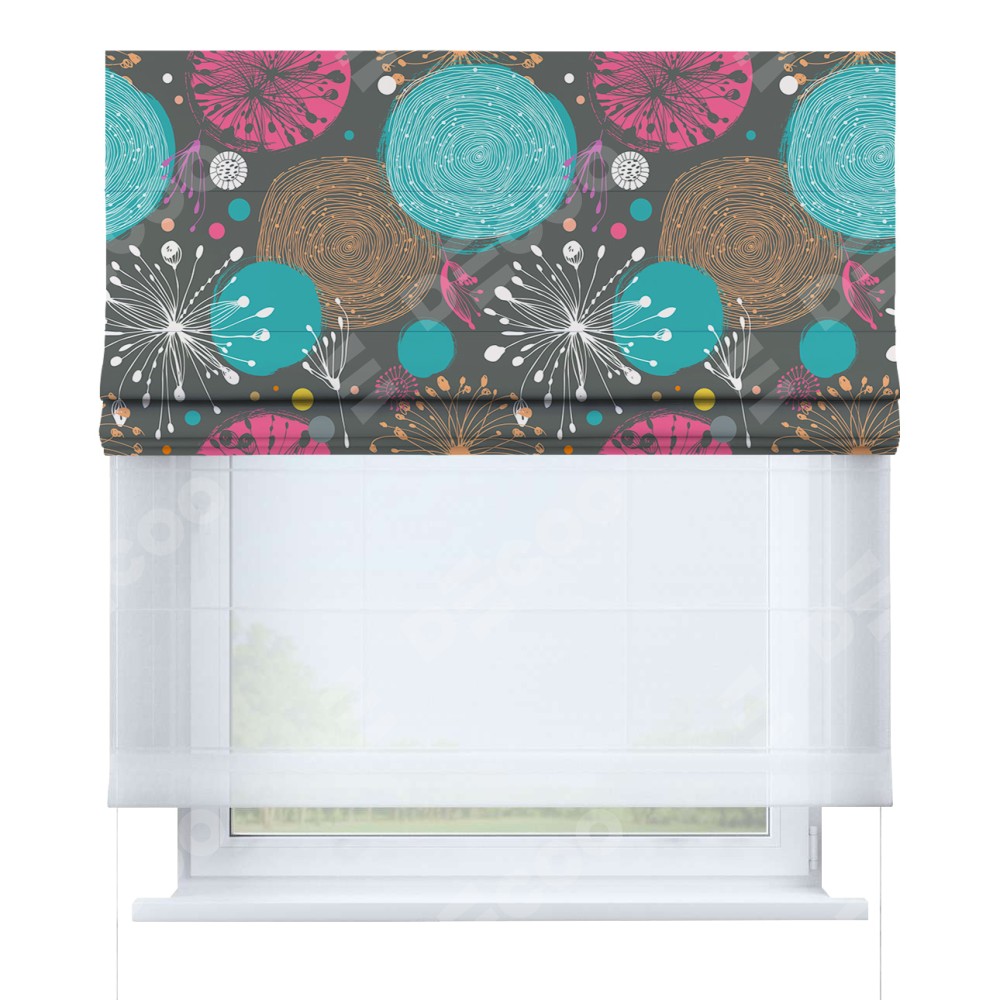 Римская штора день-ночь производителя «Cortin», используется для проёма, пошита из двух полотен, с лицевой блэкаут с нанесением сублимационной печати «Милый гранж», вторая ткань тюль (по стандарту комплектуется тюль белого цвета артикул V-01). Имеет универсальный механизм и подходит для монтажа: на потолок, на стену и в нишу.