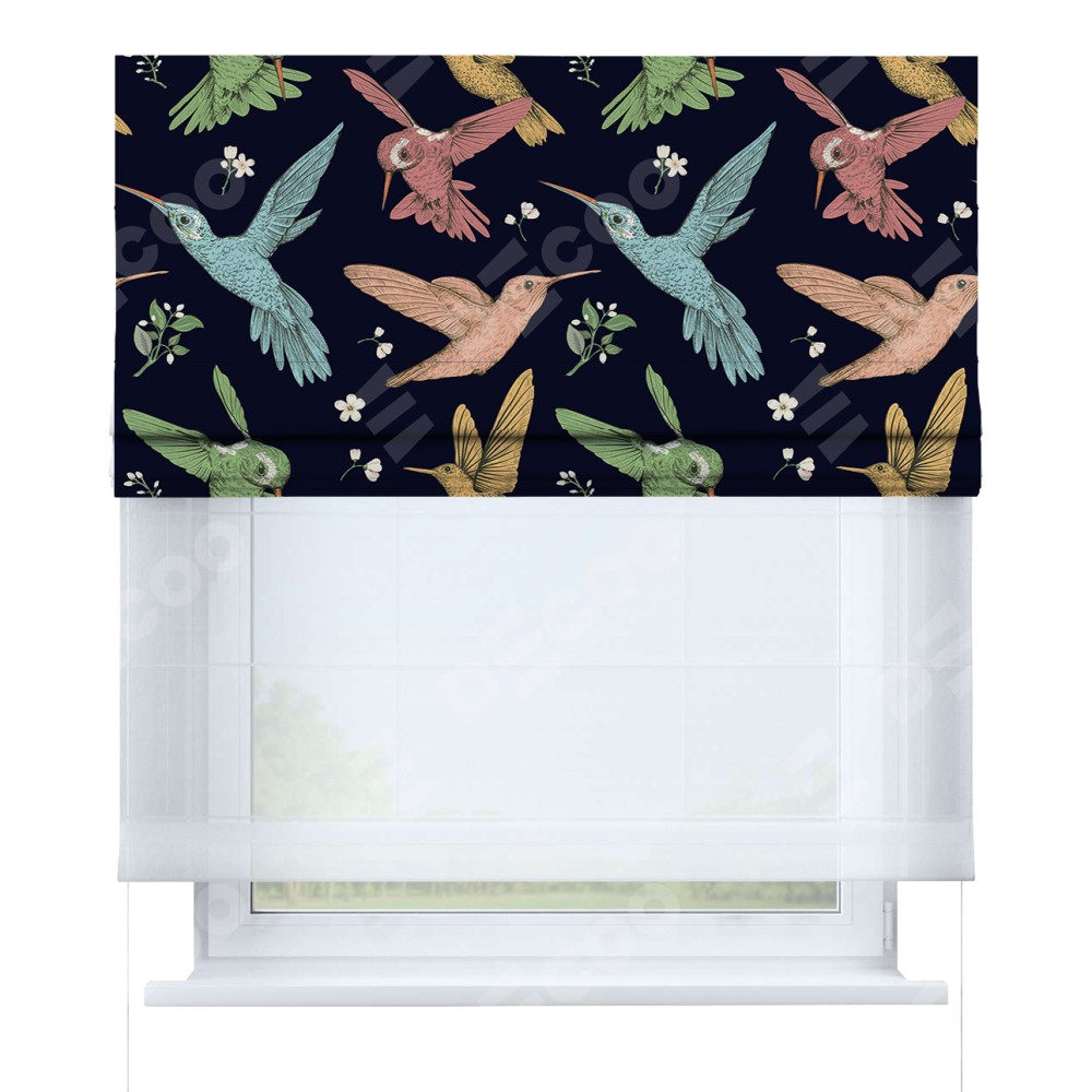Римская штора день-ночь производителя «Cortin», используется для проёма, пошита из двух полотен, с лицевой блэкаут с нанесением сублимационной печати «Птицы и цветы», вторая ткань тюль (по стандарту комплектуется тюль белого цвета артикул V-01). Имеет универсальный механизм и подходит для монтажа: на потолок, на стену и в нишу.