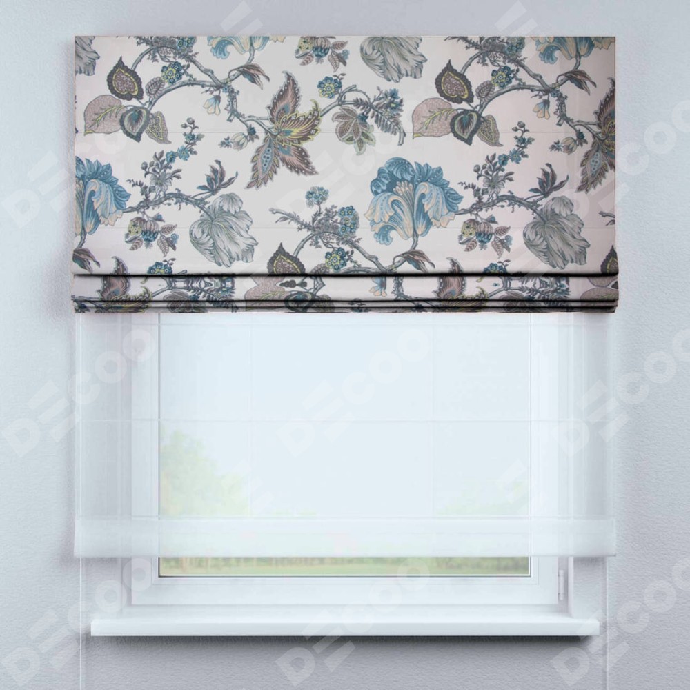 Римская штора день-ночь производителя «Cortin», используется для проёма, пошита из двух полотен, с лицевой стороны «Каприз», вторая ткань тюль (по стандарту комплектуется тюль белого цвета артикул V-01). Имеет универсальный механизм и подходит для монтажа: на потолок, на стену и в нишу.