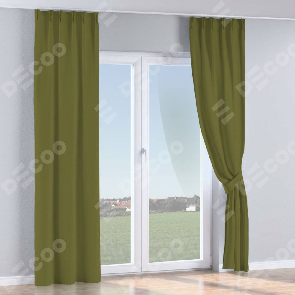 Комплект прямых штор, от производителя «Cortin», пошиты из ткани блэкаут однотонный зелёный, артикул ткани 81859. С изнаночной стороны в верхней части штор пристрачивается шторная лента с декоративными складками «Кустик». Для создания элегантных складок прямые шторы шьются по стандарту с коэффициентом 1:2 (на 100 см. ширины проёма 200 см. ширины ткани).
