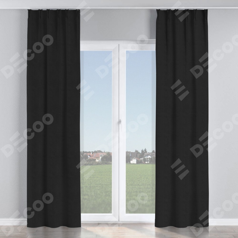 Комплект прямых штор, от производителя «Cortin», пошиты из ткани блэкаут однотонный черный, артикул ткани 79904. С изнаночной стороны в верхней части штор пристрачивается шторная лента с декоративными складками «Кустик». Для создания элегантных складок прямые шторы шьются по стандарту с коэффициентом 1:2 (на 100 см. ширины проёма 200 см. ширины ткани).