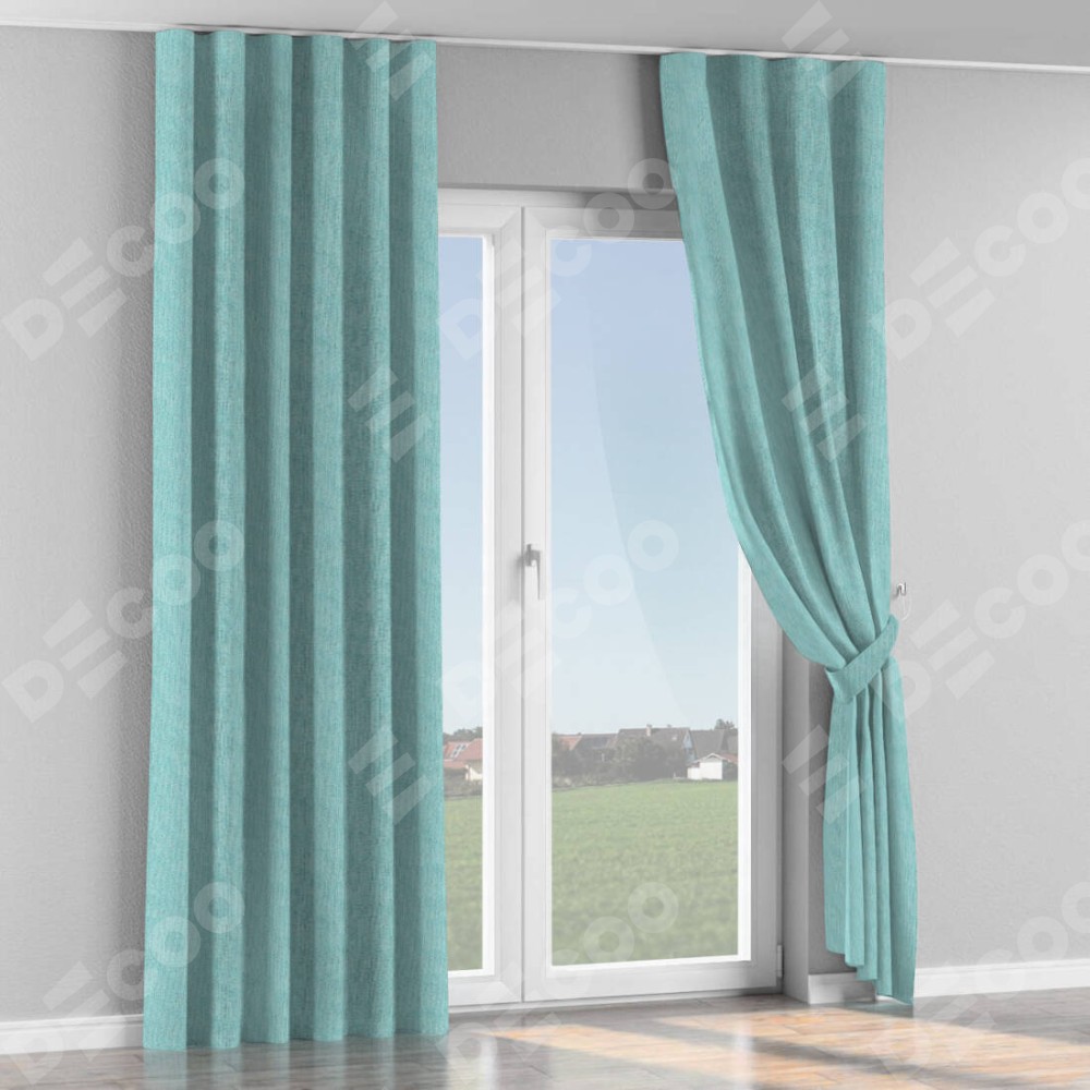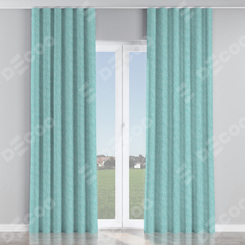 Комплект прямых штор, от производителя «Cortin», пошиты из ткани лён димаут бирюзовый, артикул ткани 23. С изнаночной стороны в верхней части штор пристрачивается шторная лента с декоративными складками «Волна». Для создания элегантных складок прямые шторы шьются по стандарту с коэффициентом 1:2 (на 100 см. ширины проёма 200 см. ширины ткани).