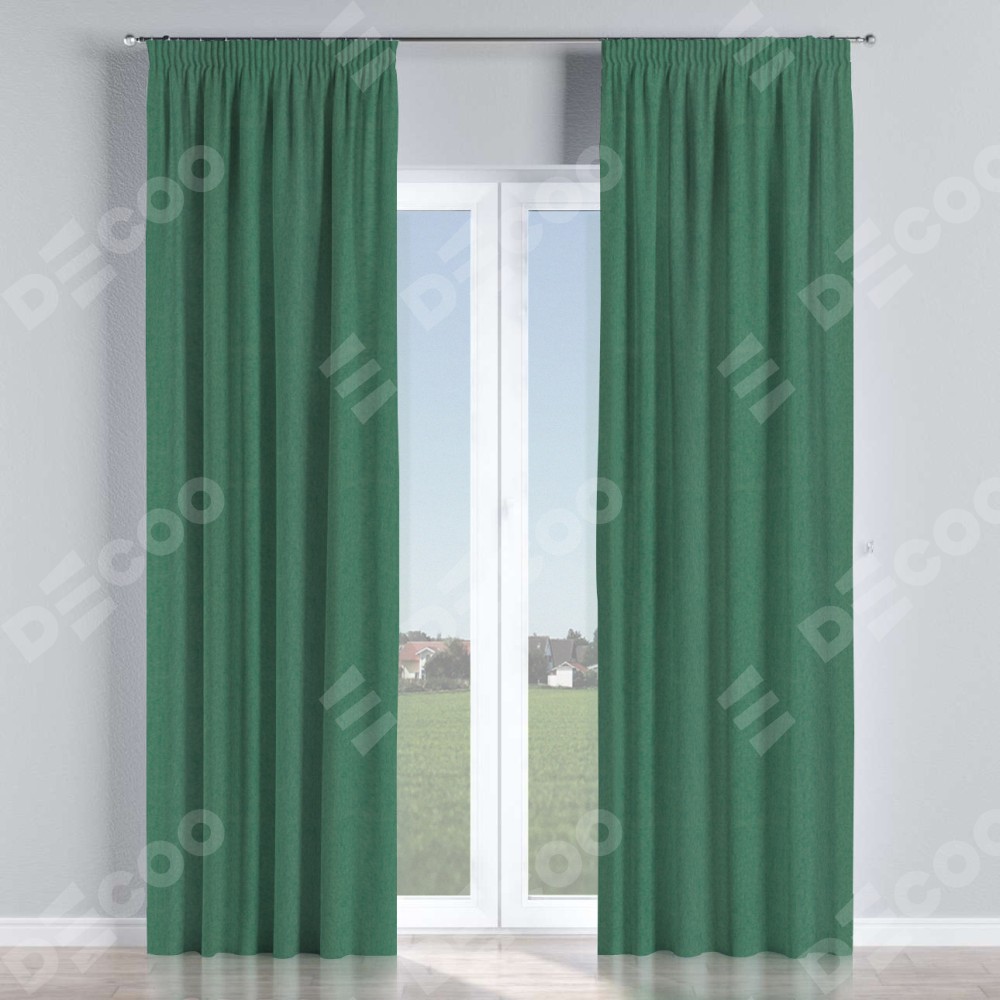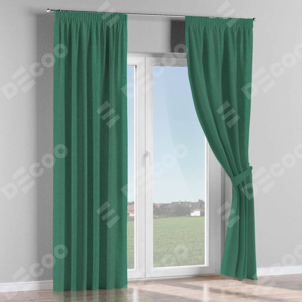 Комплект прямых штор, от производителя «Cortin», пошиты из ткани твид блэкаут зелёный, артикул ткани 21589. С изнаночной стороны в верхней части штор пристрачивается шторная лента с декоративными складками «Карандаш». Для создания элегантных складок прямые шторы шьются по стандарту с коэффициентом 1:2 (на 100 см. ширины проёма 200 см. ширины ткани).