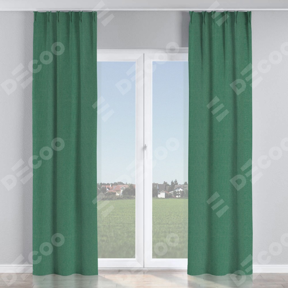 Комплект прямых штор, от производителя «Cortin», пошиты из ткани твид блэкаут зелёный, артикул ткани 21589. С изнаночной стороны в верхней части штор пристрачивается шторная лента с декоративными складками «Кустик». Для создания элегантных складок прямые шторы шьются по стандарту с коэффициентом 1:2 (на 100 см. ширины проёма 200 см. ширины ткани).