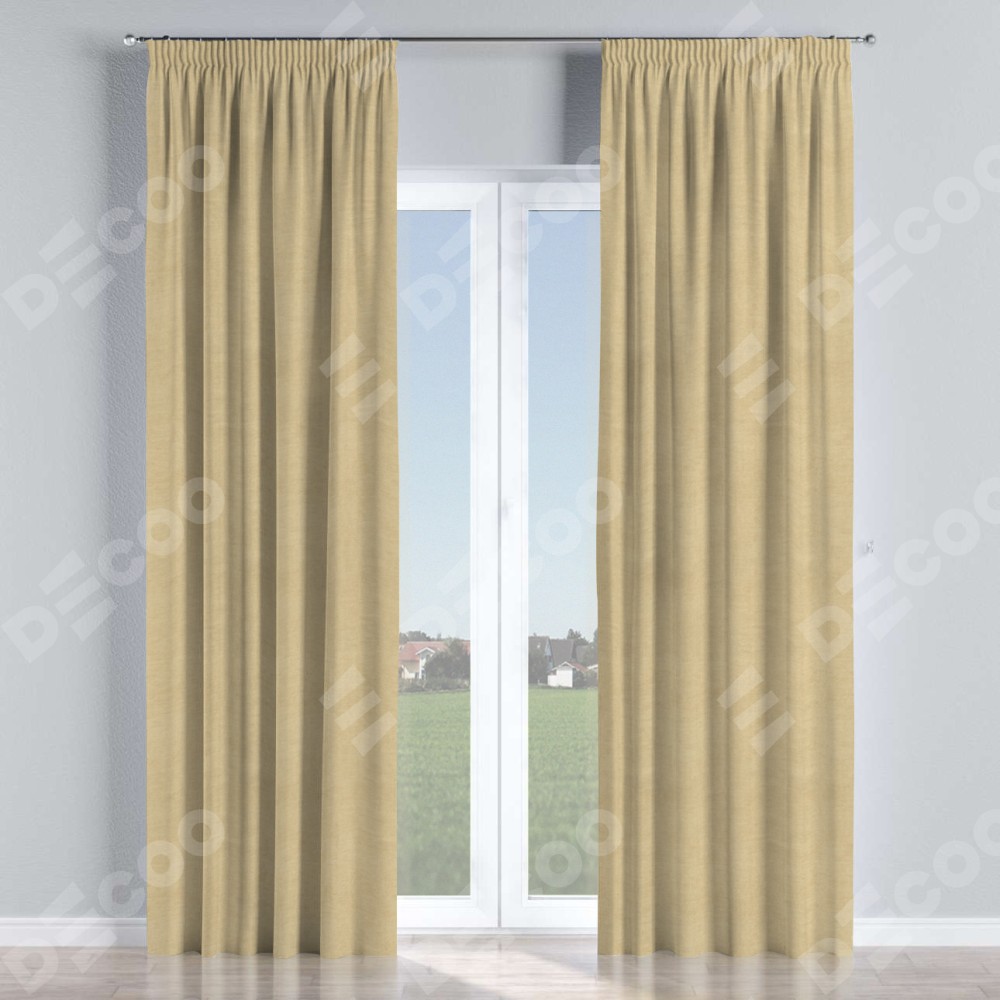Комплект прямых штор, от производителя «Cortin», пошиты из ткани вельвет бежевый, артикул ткани 85538. С изнаночной стороны в верхней части штор пристрачивается шторная лента с декоративными складками «Карандаш». Для создания элегантных складок прямые шторы шьются по стандарту с коэффициентом 1:2 (на 100 см. ширины проёма 200 см. ширины ткани).
