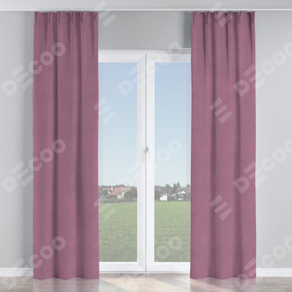 Комплект прямых штор, от производителя «Cortin», пошиты из ткани вельвет лиловый, артикул ткани 17752. С изнаночной стороны в верхней части штор пристрачивается шторная лента с декоративными складками «Кустик». Для создания элегантных складок прямые шторы шьются по стандарту с коэффициентом 1:2 (на 100 см. ширины проёма 200 см. ширины ткани).
