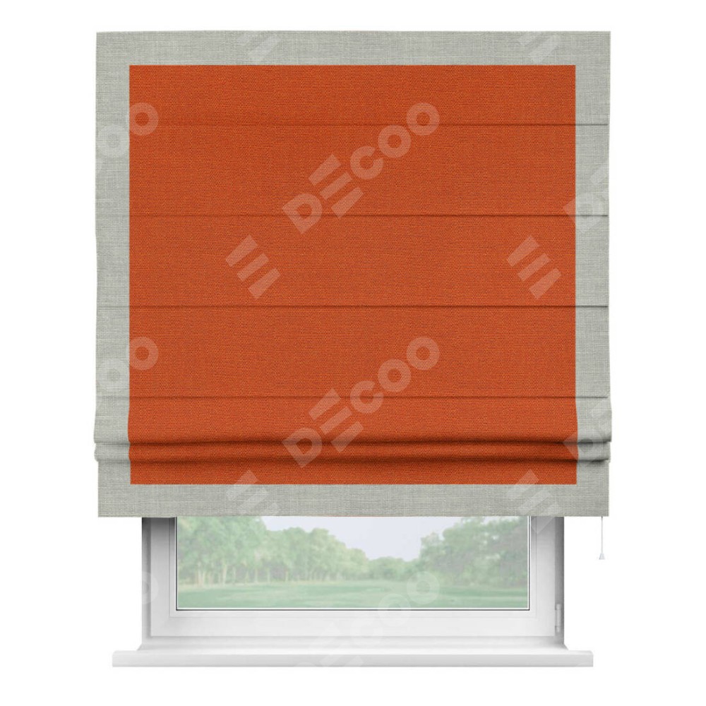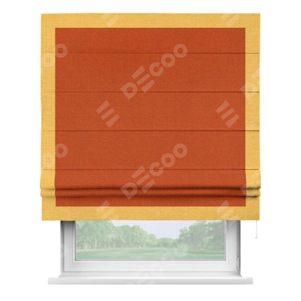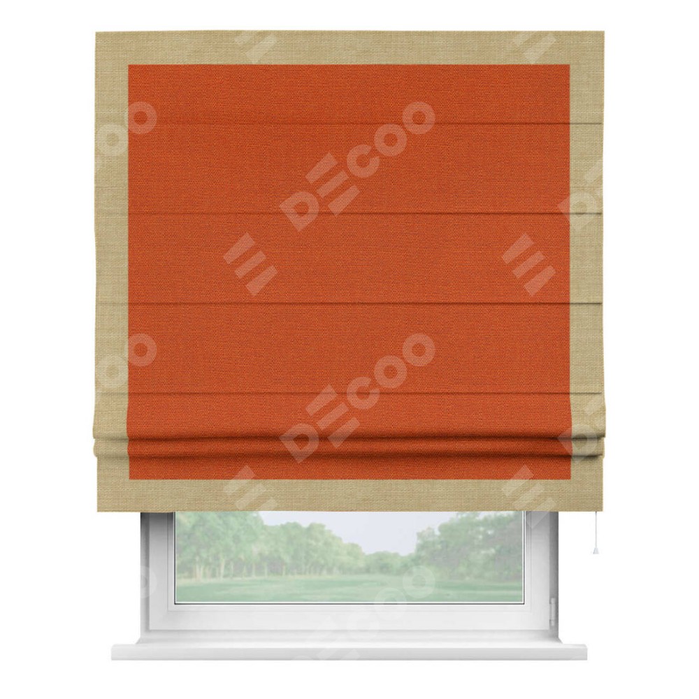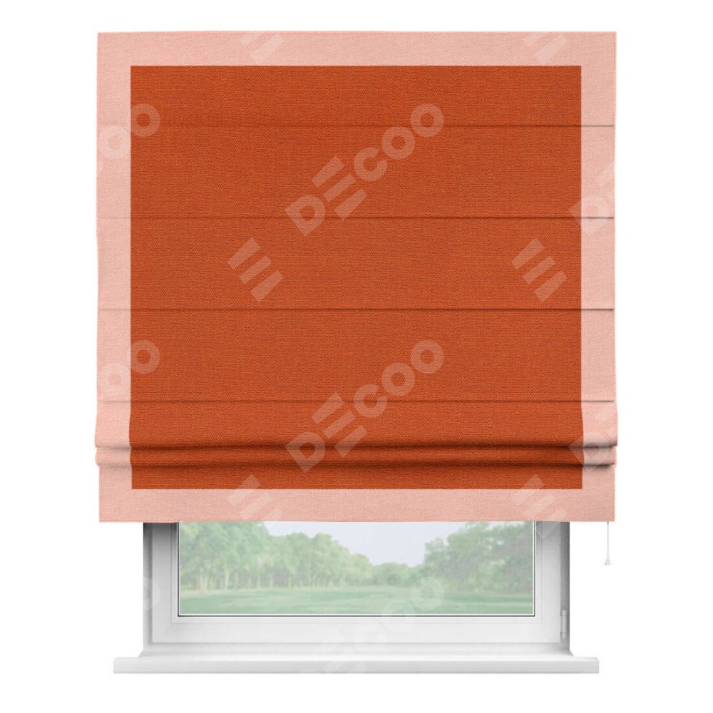 Римская штора производителя «Cortin», используется для проёма, пошита из ткани лён терракотовый, артикул 53440. Отделка шторы кантом «Чесс», ткань для канта используется из льна разной расцветки на выбор. Имеет универсальный механизм и подходит для монтажа: на потолок, на стену и в нишу.