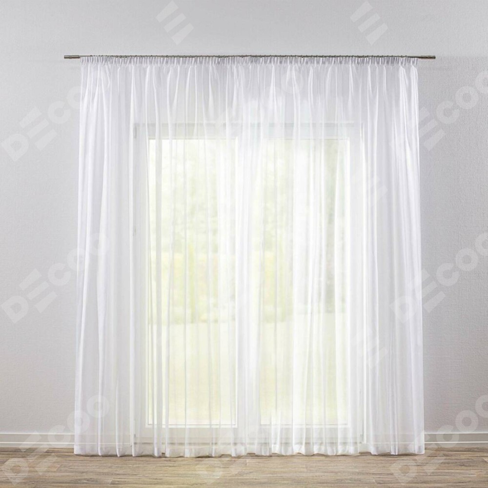 Комплект прямых штор, от производителя «Cortin», пошиты из ткани тюль белый, артикул ткани V-01. С изнаночной стороны в верхней части штор пристрачивается шторная лента с декоративными складками «Карандаш». Для создания элегантных складок прямые шторы шьются по стандарту с коэффициентом 1:2 (на 100 см. ширины проёма 200 см. ширины ткани).