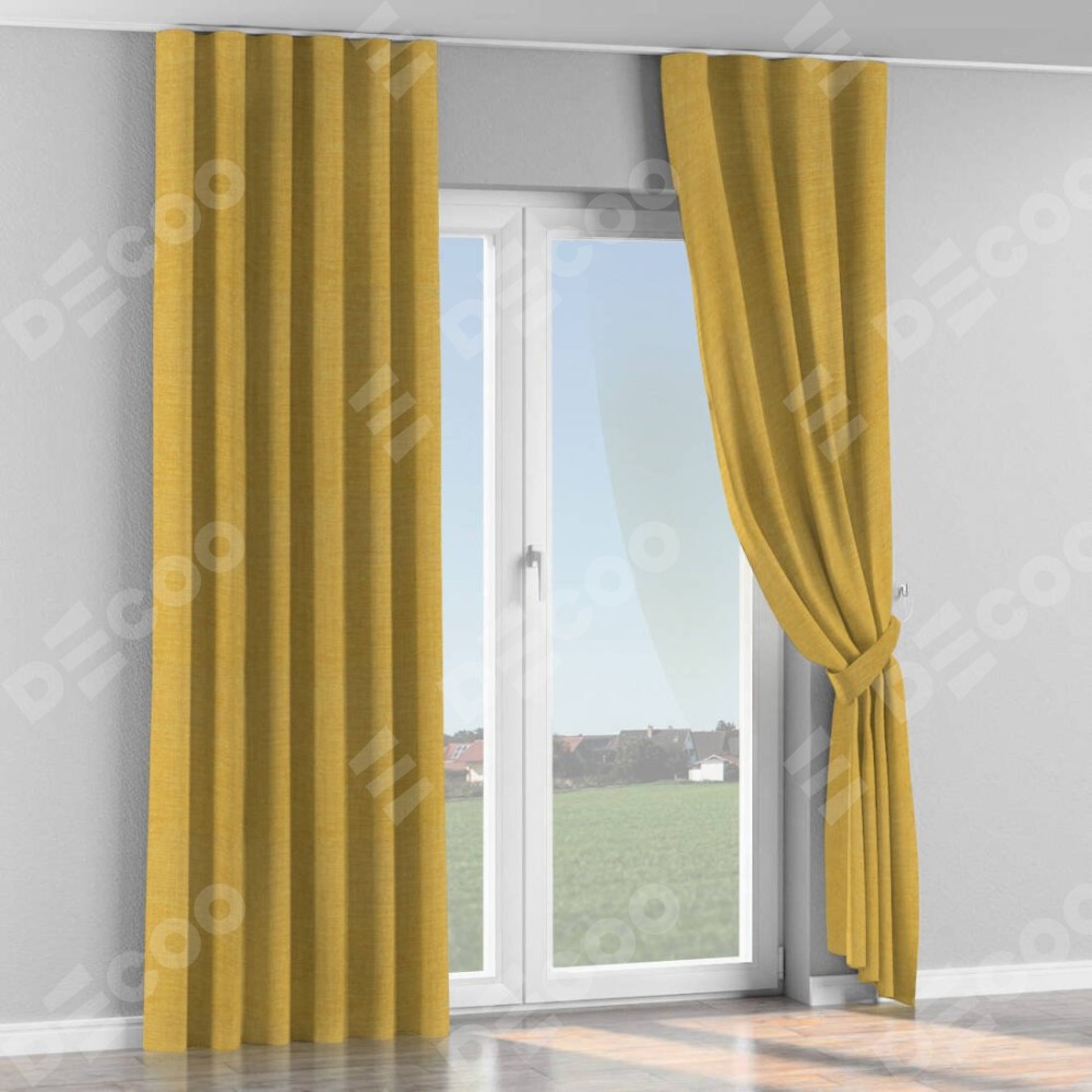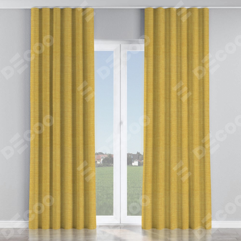Комплект прямых штор, от производителя «Cortin», пошиты из ткани лён горчичный, артикул ткани 74740. С изнаночной стороны в верхней части штор пристрачивается шторная лента с декоративными складками «Волна». Для создания элегантных складок прямые шторы шьются по стандарту с коэффициентом 1:2 (на 100 см. ширины проёма 200 см. ширины ткани).