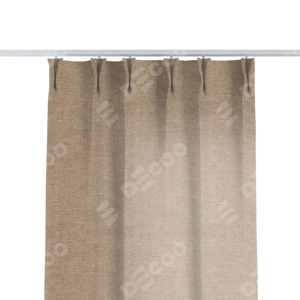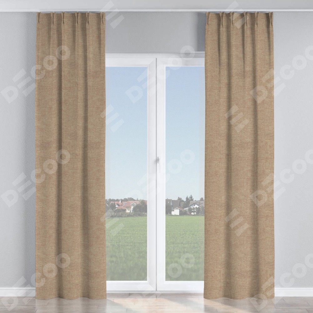 Комплект прямых штор, от производителя «Cortin», пошиты из ткани лён кашемир коричневый, артикул ткани 21614. С изнаночной стороны в верхней части штор пристрачивается шторная лента с декоративными складками «Кустик». Для создания элегантных складок прямые шторы шьются по стандарту с коэффициентом 1:2 (на 100 см. ширины проёма 200 см. ширины ткани).