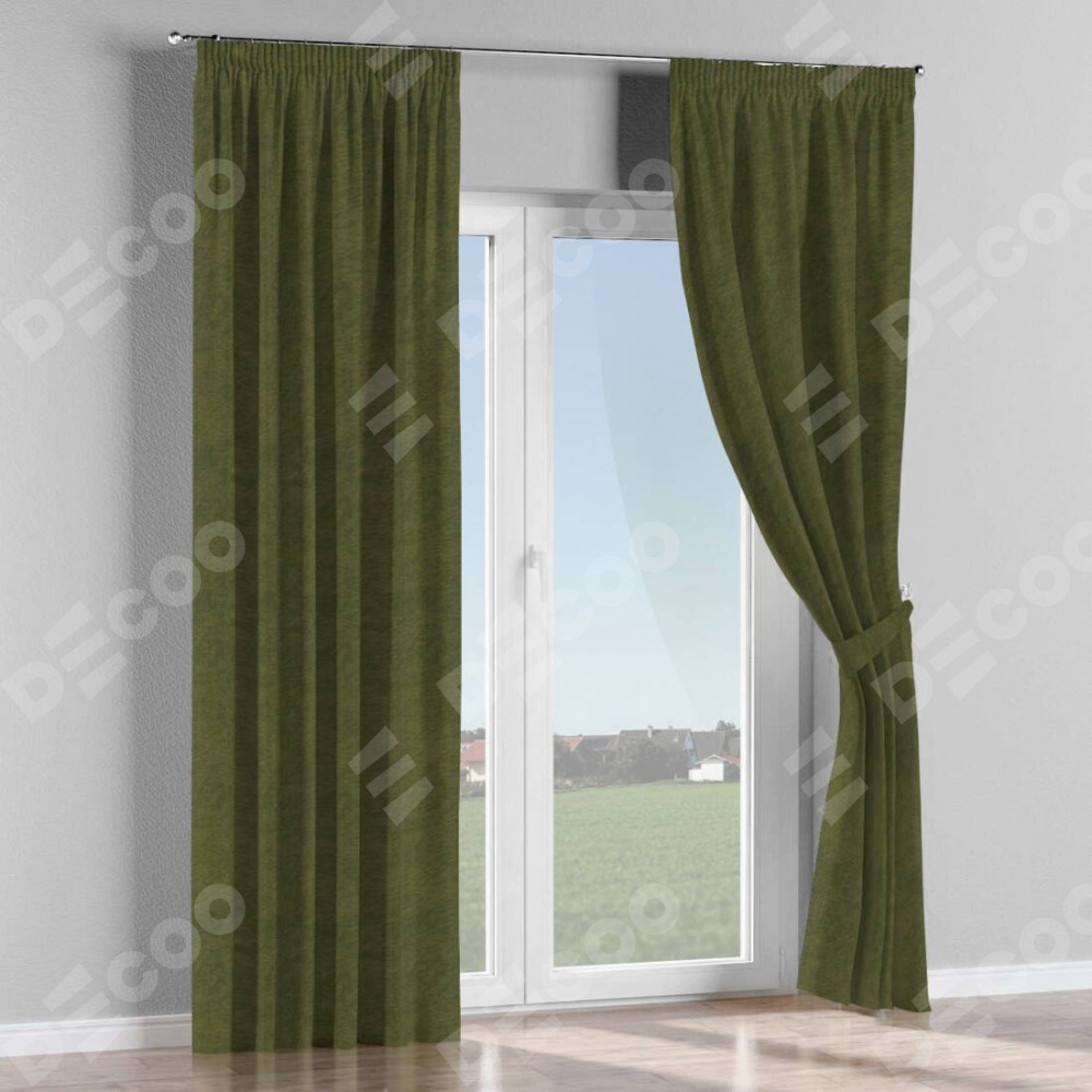 Комплект прямых штор, от производителя «Cortin», пошиты из ткани софт однотонный зелёный, артикул ткани 33110. С изнаночной стороны в верхней части штор пристрачивается шторная лента с декоративными складками «Карандаш». Для создания элегантных складок прямые шторы шьются по стандарту с коэффициентом 1:2 (на 100 см. ширины проёма 200 см. ширины ткани).