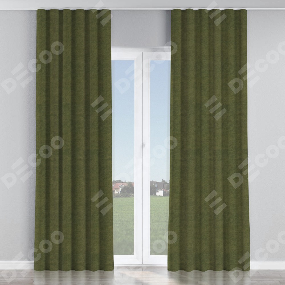 Комплект прямых штор, от производителя «Cortin», пошиты из ткани софт однотонный зелёный, артикул ткани 33110. С изнаночной стороны в верхней части штор пристрачивается шторная лента с декоративными складками «Волна». Для создания элегантных складок прямые шторы шьются по стандарту с коэффициентом 1:2 (на 100 см. ширины проёма 200 см. ширины ткани).