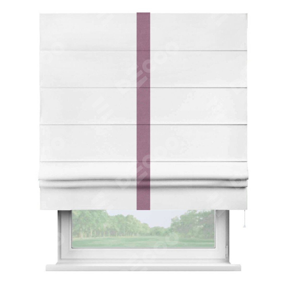 Римская штора производителя «Cortin», используется для проёма, пошита из ткани вельвет белый, артикул ткани 10810. Отделка шторы кантом «Хайвей», ткань для канта используется из вельвета разной расцветки на выбор. Имеет универсальный механизм и подходит для монтажа: на потолок, на стену и в нишу.