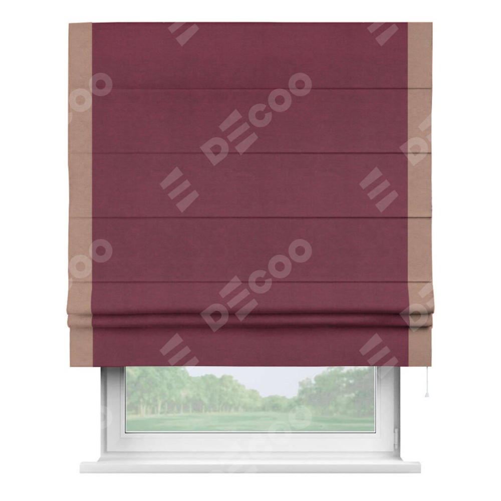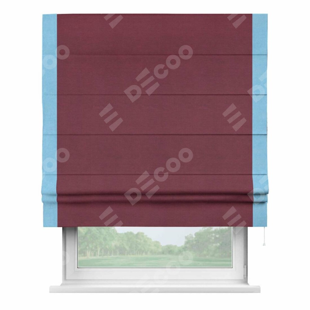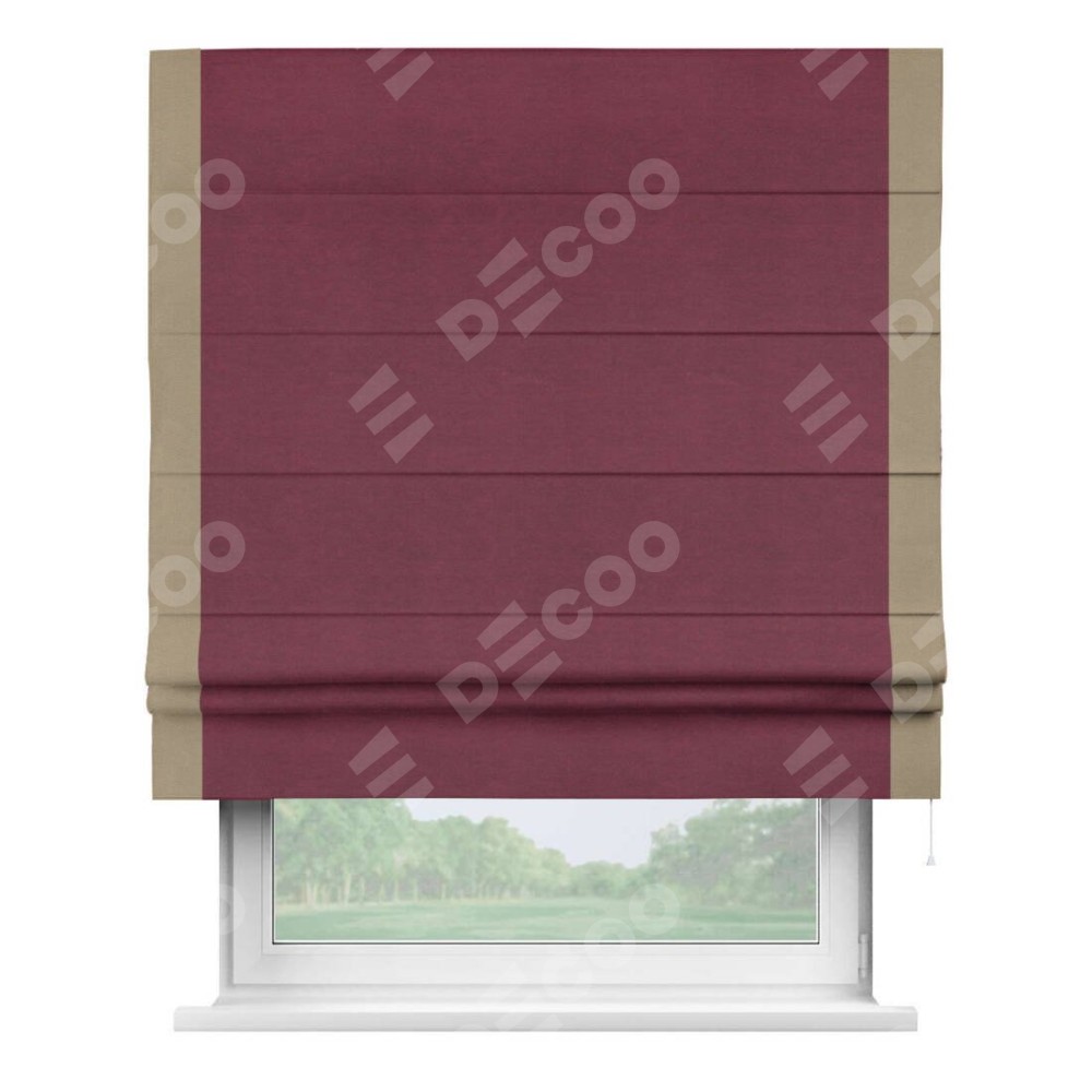 Римская штора производителя «Cortin», используется для проёма, пошита из ткани вельвет бордовый, артикул ткани 85553. Отделка шторы кантом «Стрим Дуо», ткань для канта используется из вельвета разной расцветки на выбор. Имеет универсальный механизм и подходит для монтажа: на потолок, на стену и в нишу.