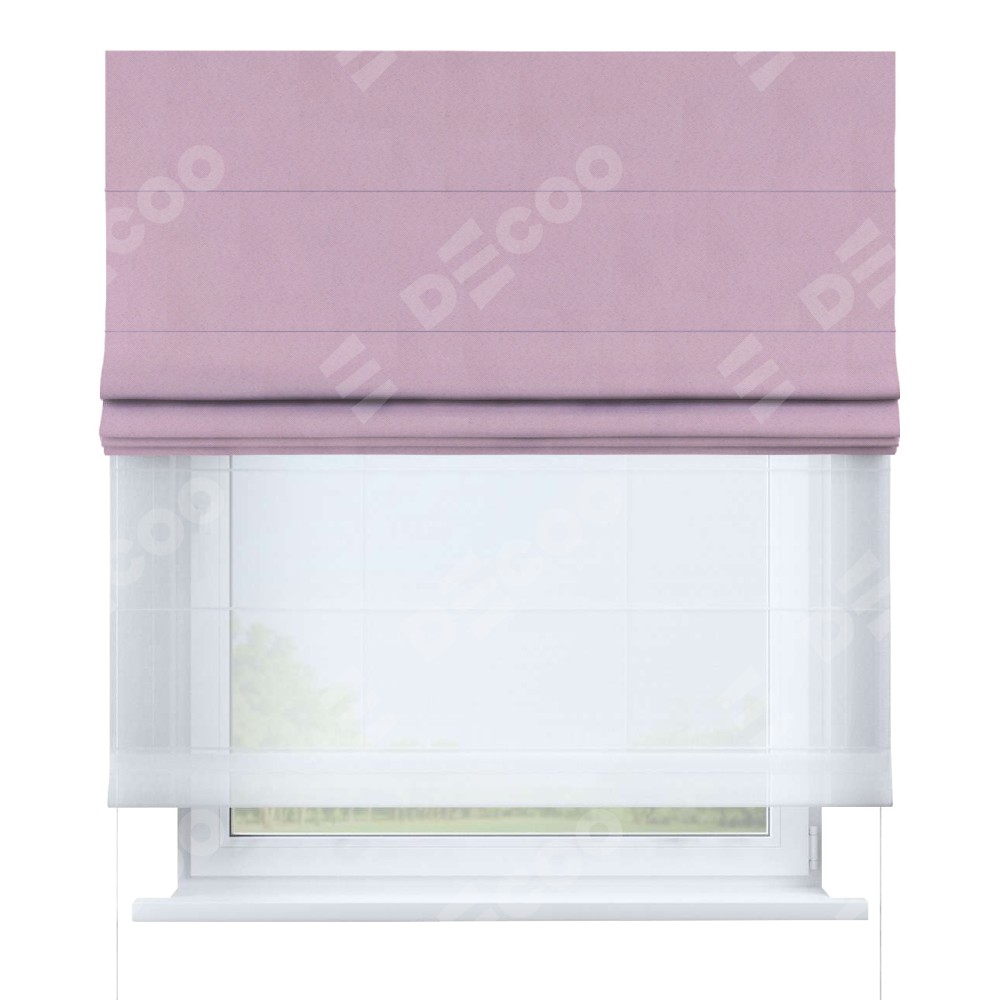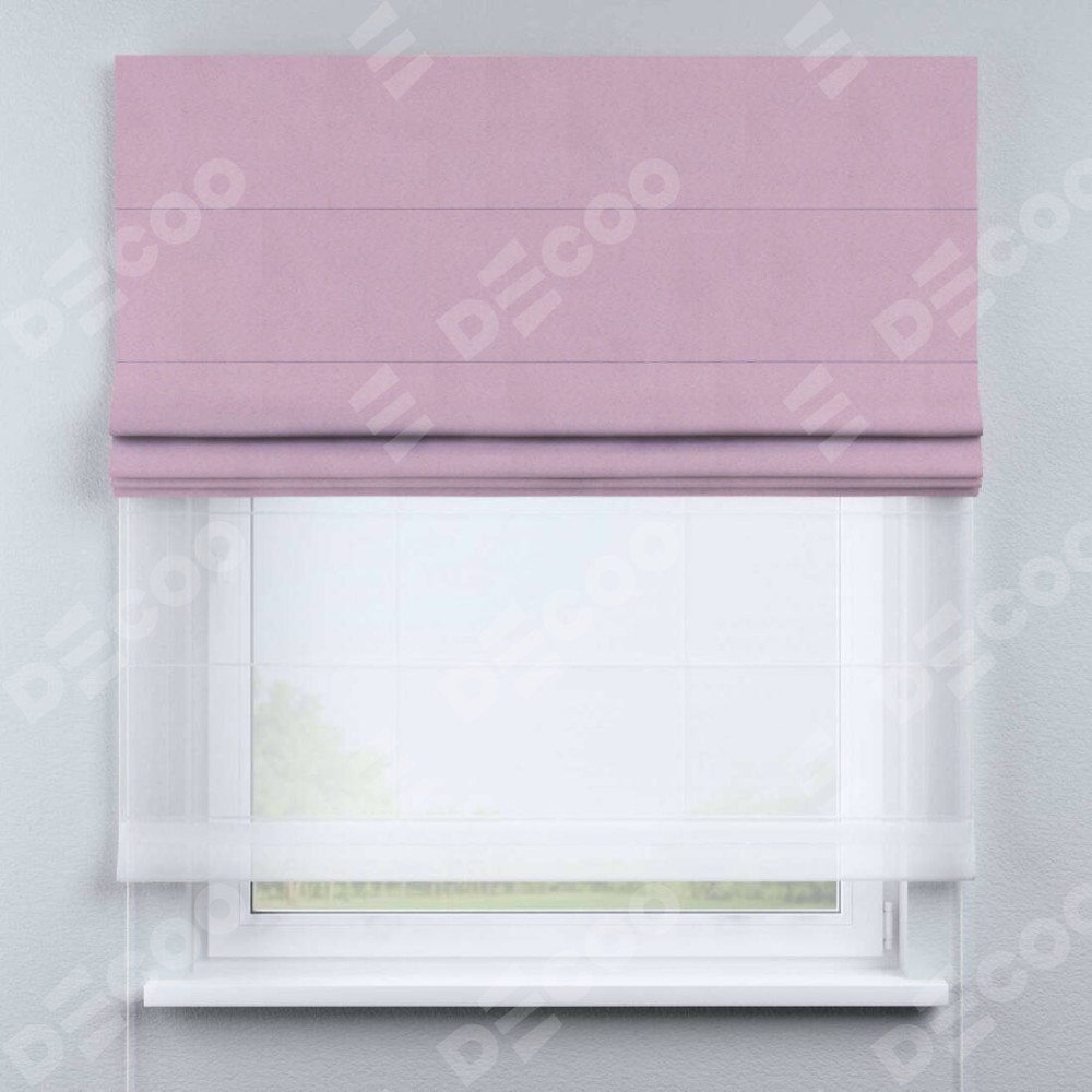 Римская штора день-ночь производителя «Cortin», используется для проёма, пошита из двух полотен, с лицевой стороны pipa блэкаут розовый артикул 12091, вторая ткань тюль (по стандарту комплектуется тюль белого цвета артикул V-01). Имеет универсальный механизм и подходит для монтажа: на потолок, на стену и в нишу.
