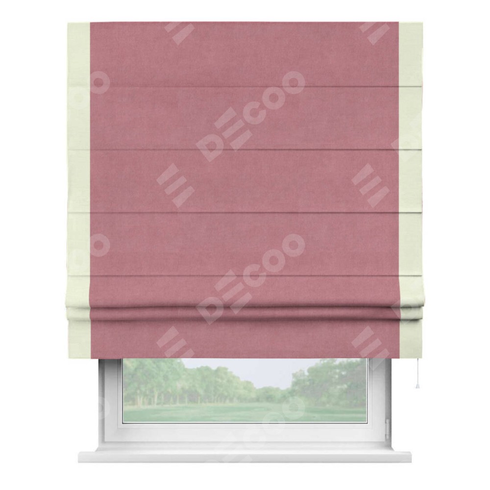 Римская штора производителя «Cortin», используется для проёма, пошита из ткани вельвет брусника, артикул ткани 85550. Отделка шторы кантом «Стрим Дуо», ткань для канта используется из вельвета разной расцветки на выбор. Имеет универсальный механизм и подходит для монтажа: на потолок, на стену и в нишу.