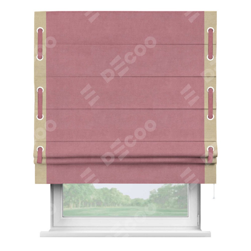 Римская штора производителя «Cortin», используется для проёма, пошита из ткани вельвет брусника, артикул ткани 85550. Отделка шторы кантом «Стрим Дуо» на кантах расположены люверсы с пояском, ткань для канта используется из вельвета разной расцветки на выбор. Ткань для пояска обычно используется из основной ткани шторы, а так же можно сделать из любой расцветки по желанию. Имеет универсальный механизм и подходит для монтажа: на потолок, на стену и в нишу.