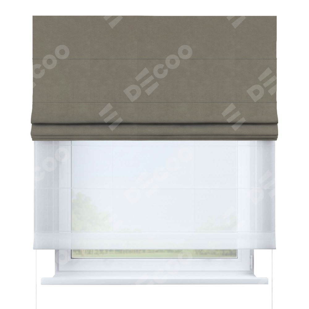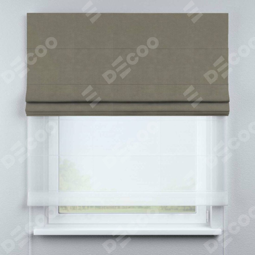 Римская штора день-ночь производителя «Cortin», используется для проёма, пошита из двух полотен, с лицевой стороны бархат ария артикул 31, вторая ткань тюль (по стандарту комплектуется тюль белого цвета артикул V-01). Имеет универсальный механизм и подходит для монтажа: на потолок, на стену и в нишу.