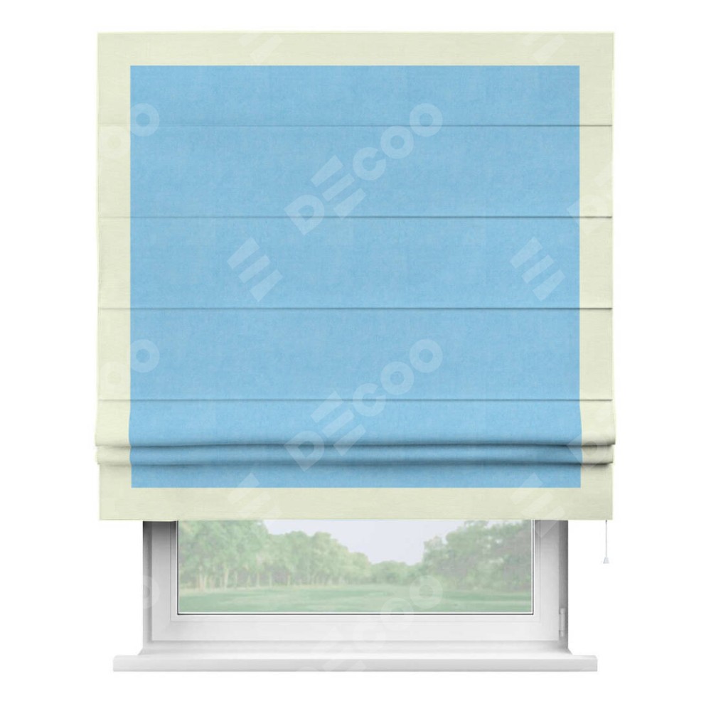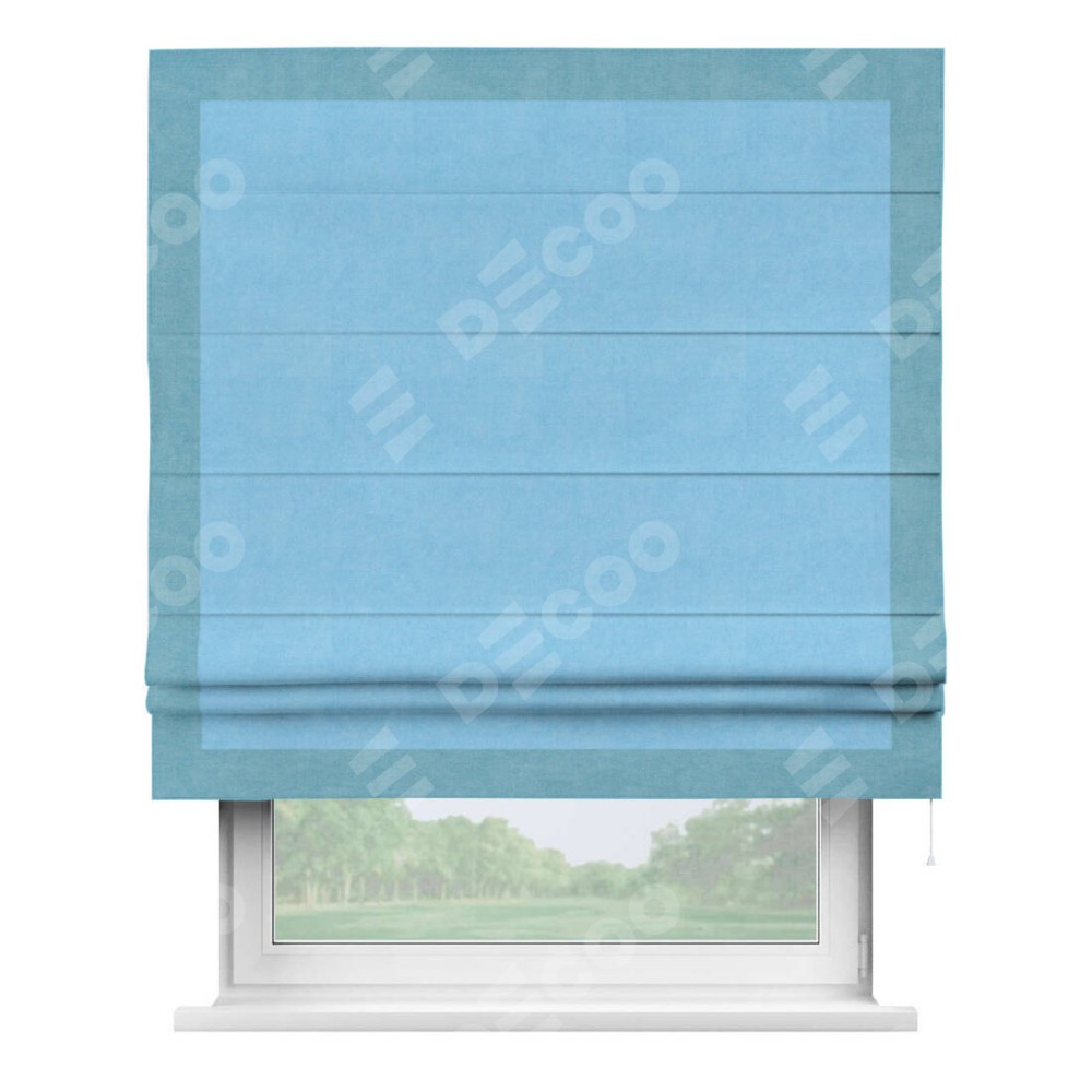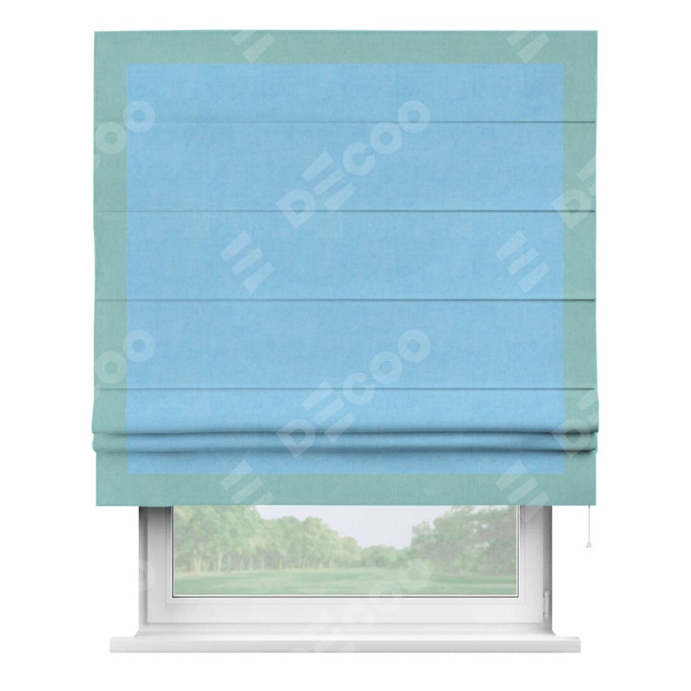 Римская штора производителя «Cortin», используется для проёма, пошита из ткани вельвет голубой, артикул ткани 85544. Отделка шторы кантом «Чесс», ткань для канта используется из вельвета разной расцветки на выбор. Имеет универсальный механизм и подходит для монтажа: на потолок, на стену и в нишу.