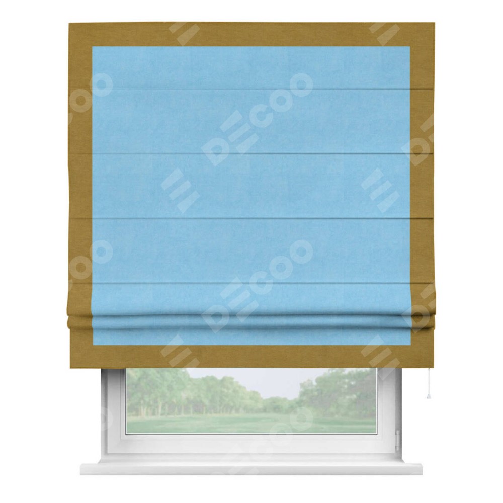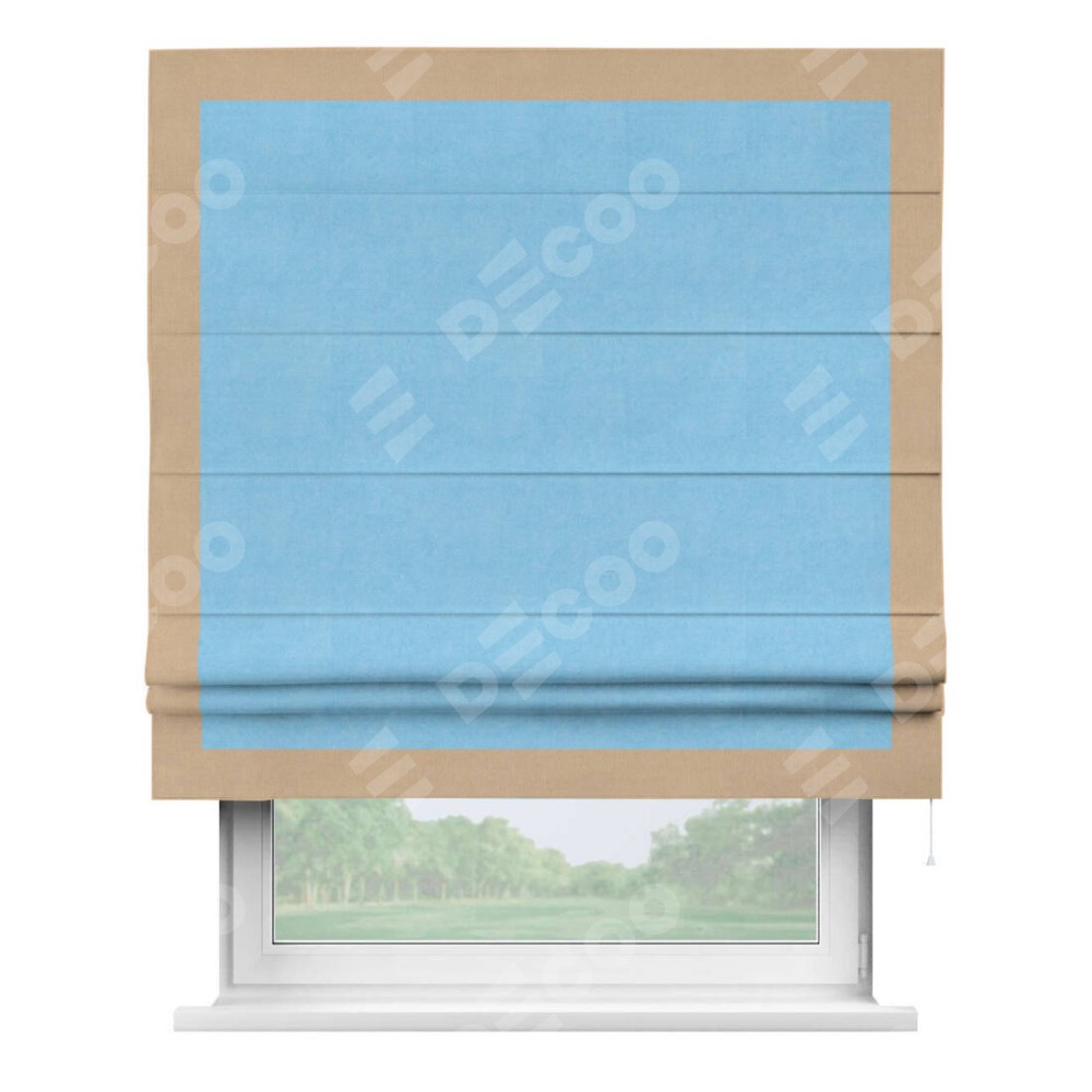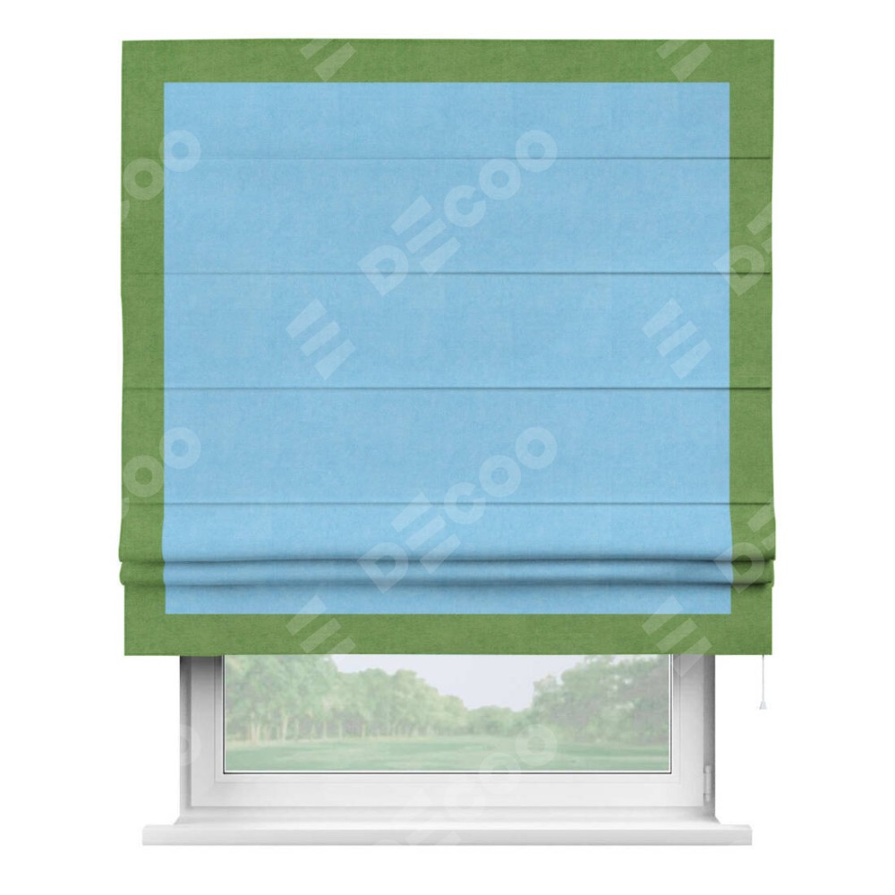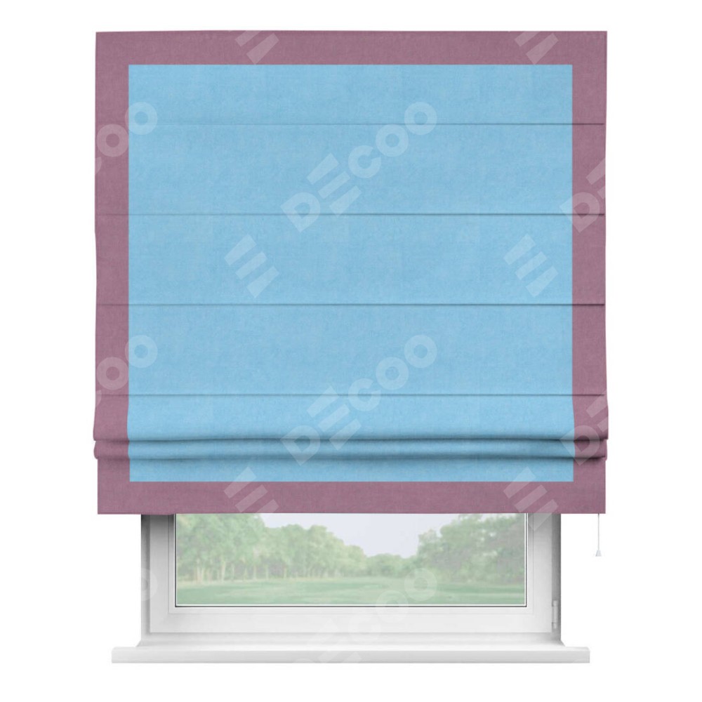 Римская штора производителя «Cortin», используется для проёма, пошита из ткани вельвет голубой, артикул ткани 85544. Отделка шторы кантом «Чесс», ткань для канта используется из вельвета разной расцветки на выбор. Имеет универсальный механизм и подходит для монтажа: на потолок, на стену и в нишу.