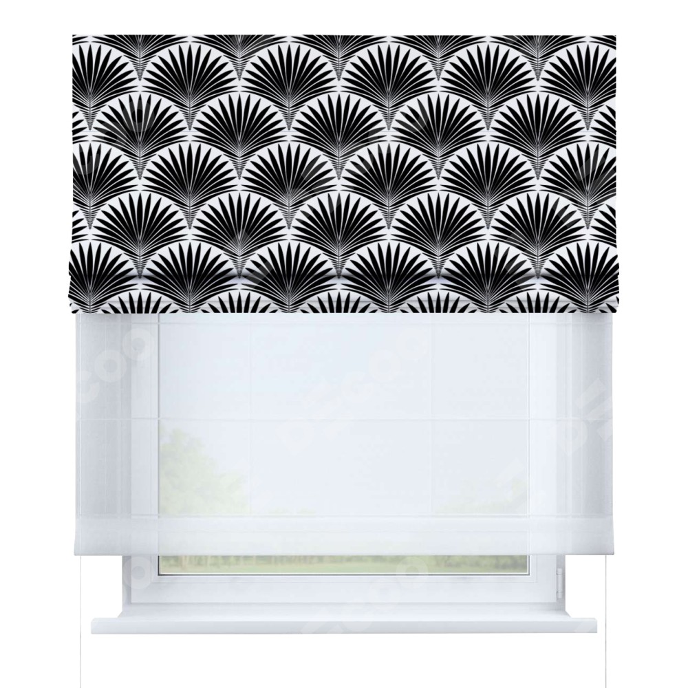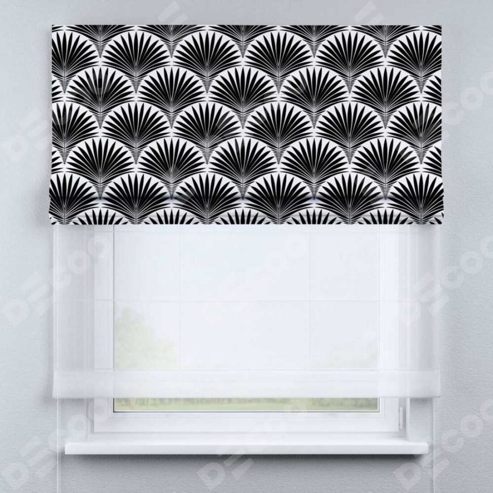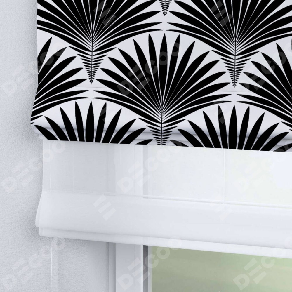 Римская штора день-ночь производителя «Cortin», используется для проёма, пошита из двух полотен, с лицевой блэкаут с нанесением сублимационной печати «Арт-деко листья черный», вторая ткань тюль (по стандарту комплектуется тюль белого цвета артикул V-01). Имеет универсальный механизм и подходит для монтажа: на потолок, на стену и в нишу.
