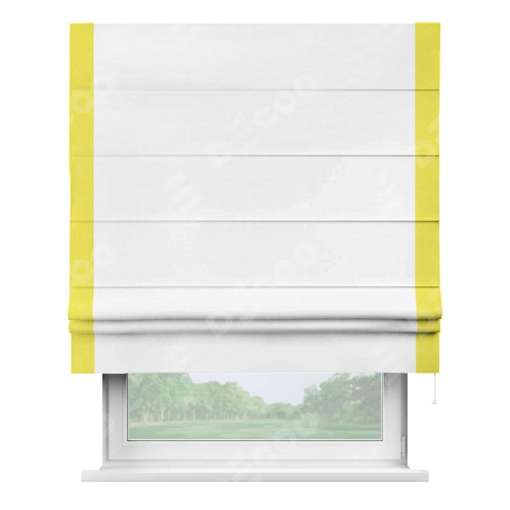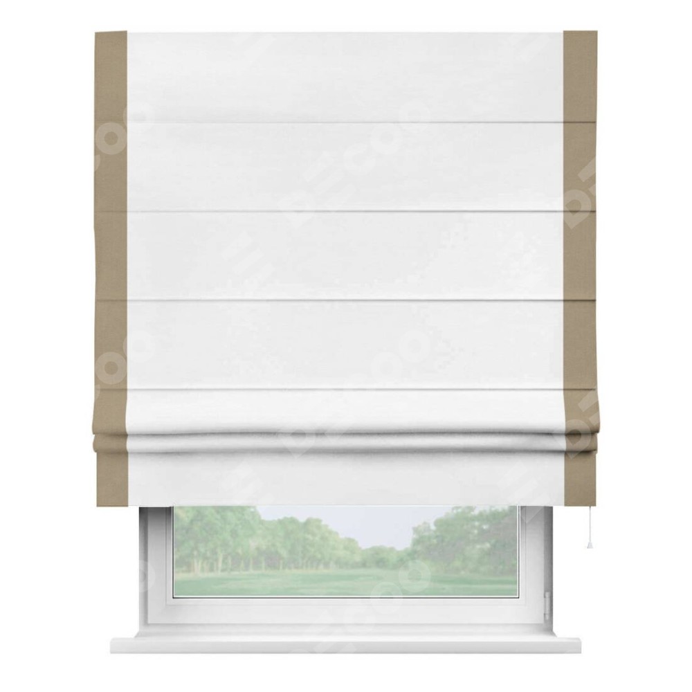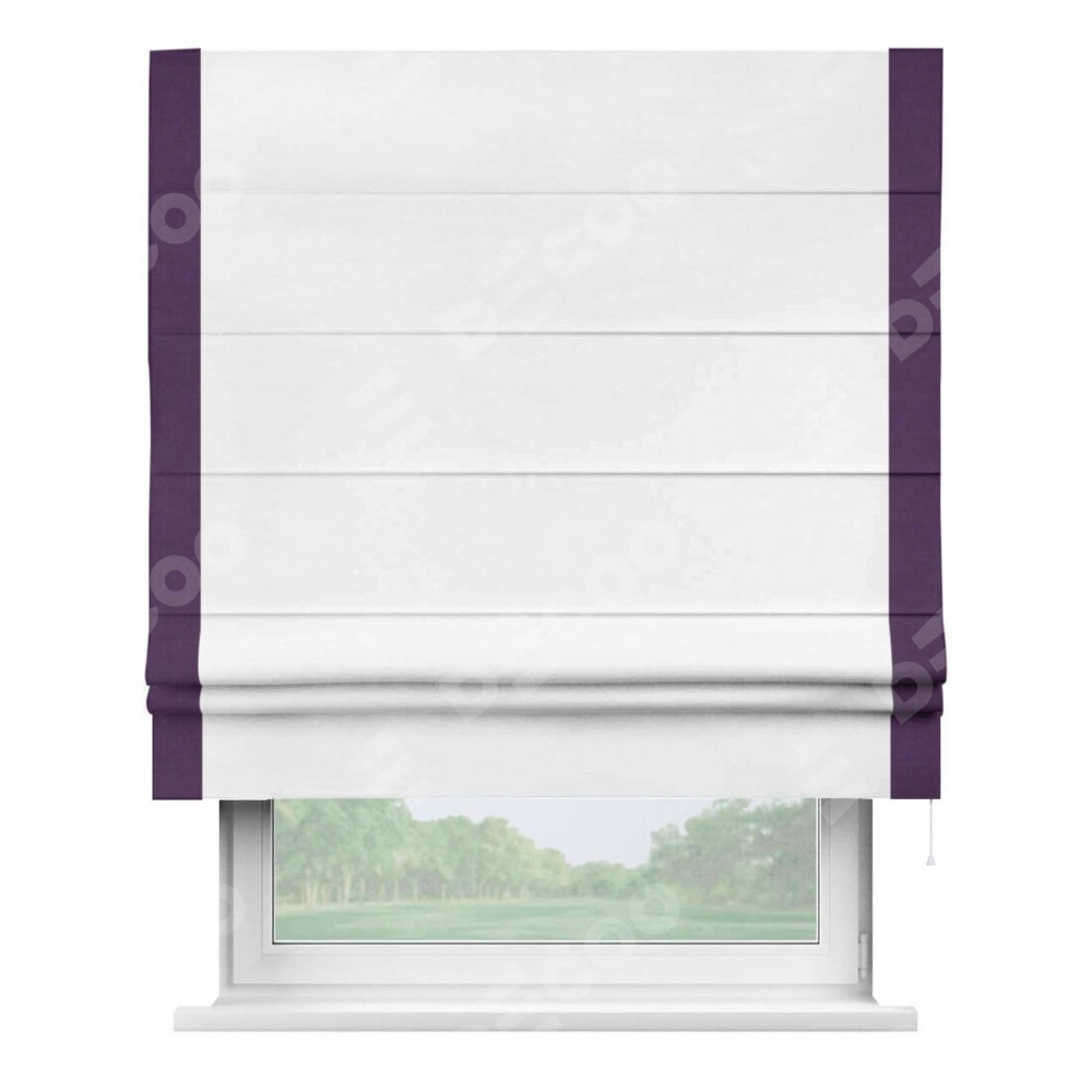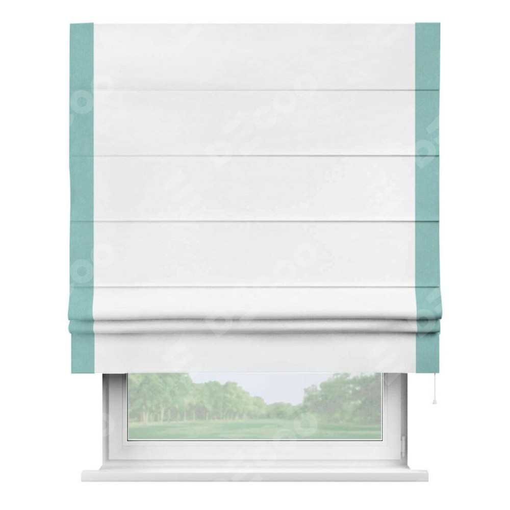Римская штора производителя «Cortin», используется для проёма, пошита из ткани вельвет дымчато-белый, артикул ткани 85535. Отделка шторы кантом «Стрим Дуо», ткань для канта используется из вельвета разной расцветки на выбор. Имеет универсальный механизм и подходит для монтажа: на потолок, на стену и в нишу.