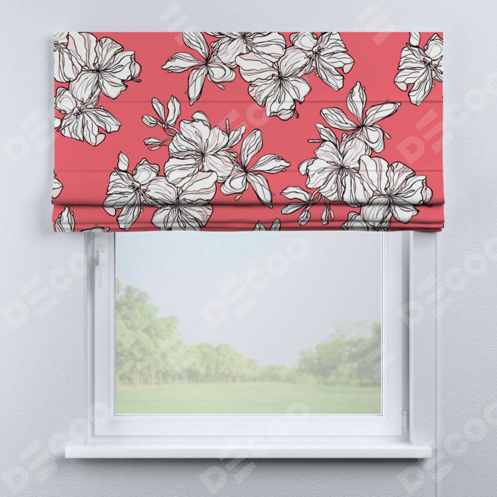 Римская штора производителя «Cortin», используется для проёма, пошита из ткани блэкаут с нанесением сублимационной печати «Белые цветы». Имеет универсальный механизм и подходит для монтажа: на потолок, на стену и в нишу.