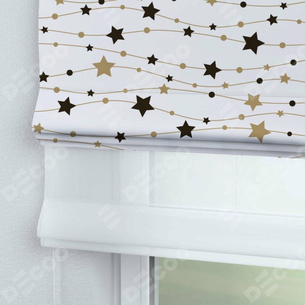 Римская штора день-ночь производителя «Cortin», используется для проёма, пошита из двух полотен, с лицевой блэкаут с нанесением сублимационной печати «Звёздная нить», вторая ткань тюль (по стандарту комплектуется тюль белого цвета артикул V-01). Имеет универсальный механизм и подходит для монтажа: на потолок, на стену и в нишу.