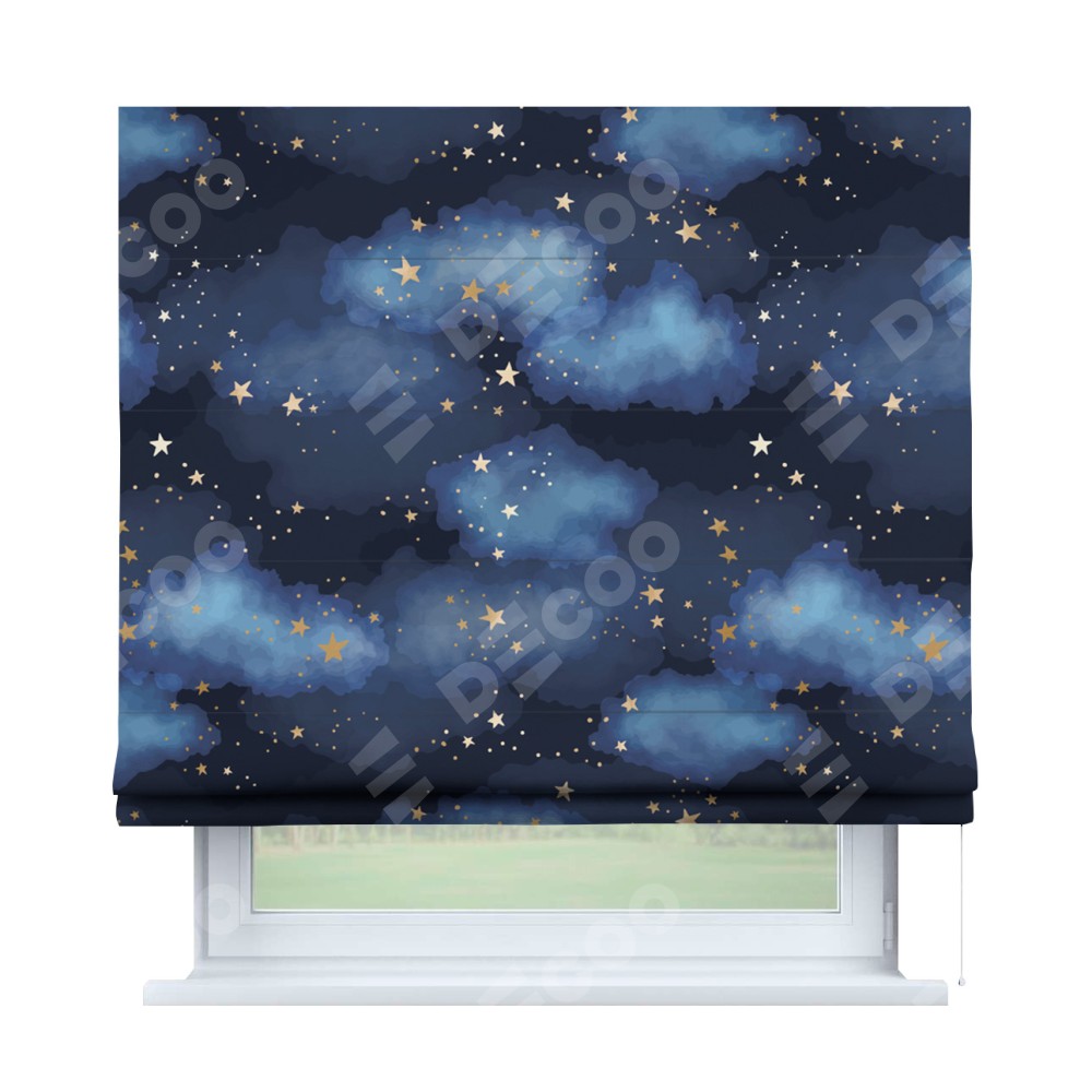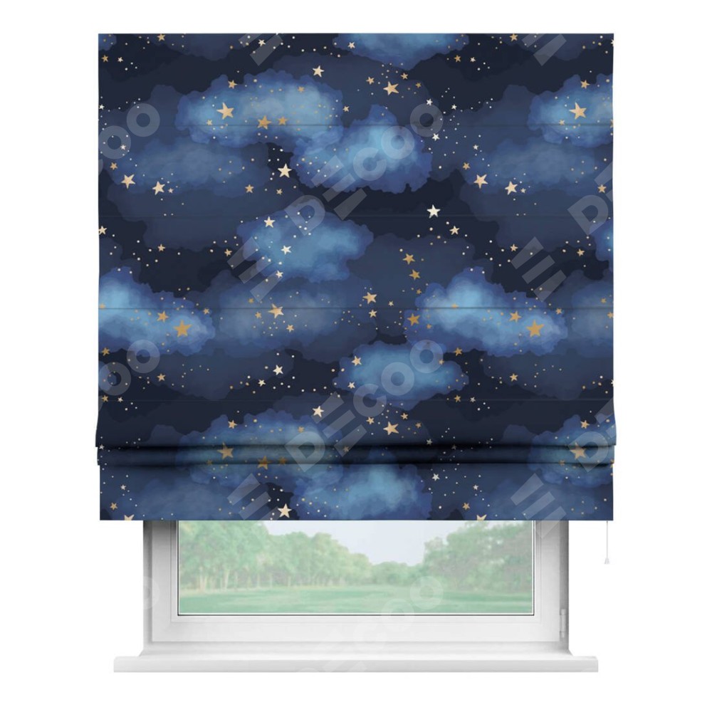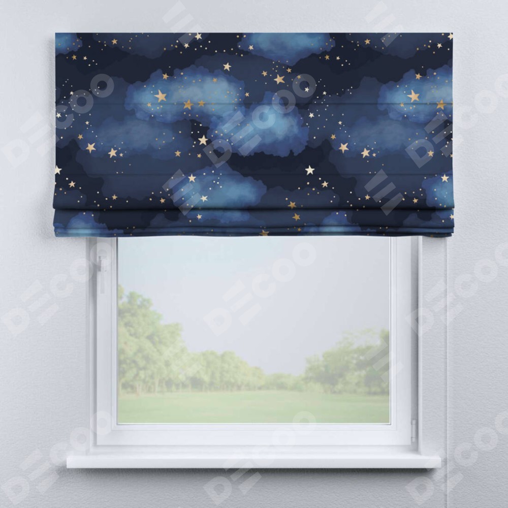 Римская штора производителя «Cortin», используется для проёма, пошита из ткани блэкаут с нанесением сублимационной печати «Золотые звёзды». Имеет универсальный механизм и подходит для монтажа: на потолок, на стену и в нишу.