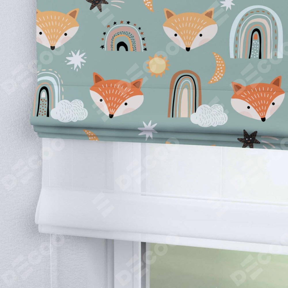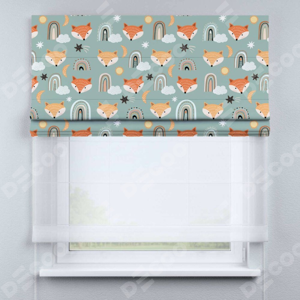Римская штора день-ночь производителя «Cortin», используется для проёма, пошита из двух полотен, с лицевой блэкаут с нанесением сублимационной печати «Озорные лисички», вторая ткань тюль (по стандарту комплектуется тюль белого цвета артикул V-01). Имеет универсальный механизм и подходит для монтажа: на потолок, на стену и в нишу.