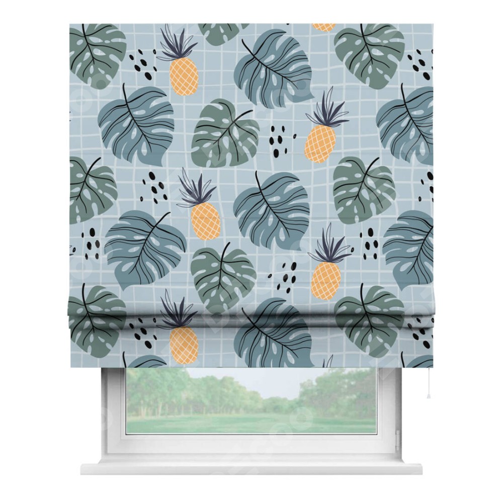 Римская штора производителя «Cortin», используется для проёма, пошита из ткани блэкаут с нанесением сублимационной печати «Ананасы и листья монстеры». Имеет универсальный механизм и подходит для монтажа: на потолок, на стену и в нишу.