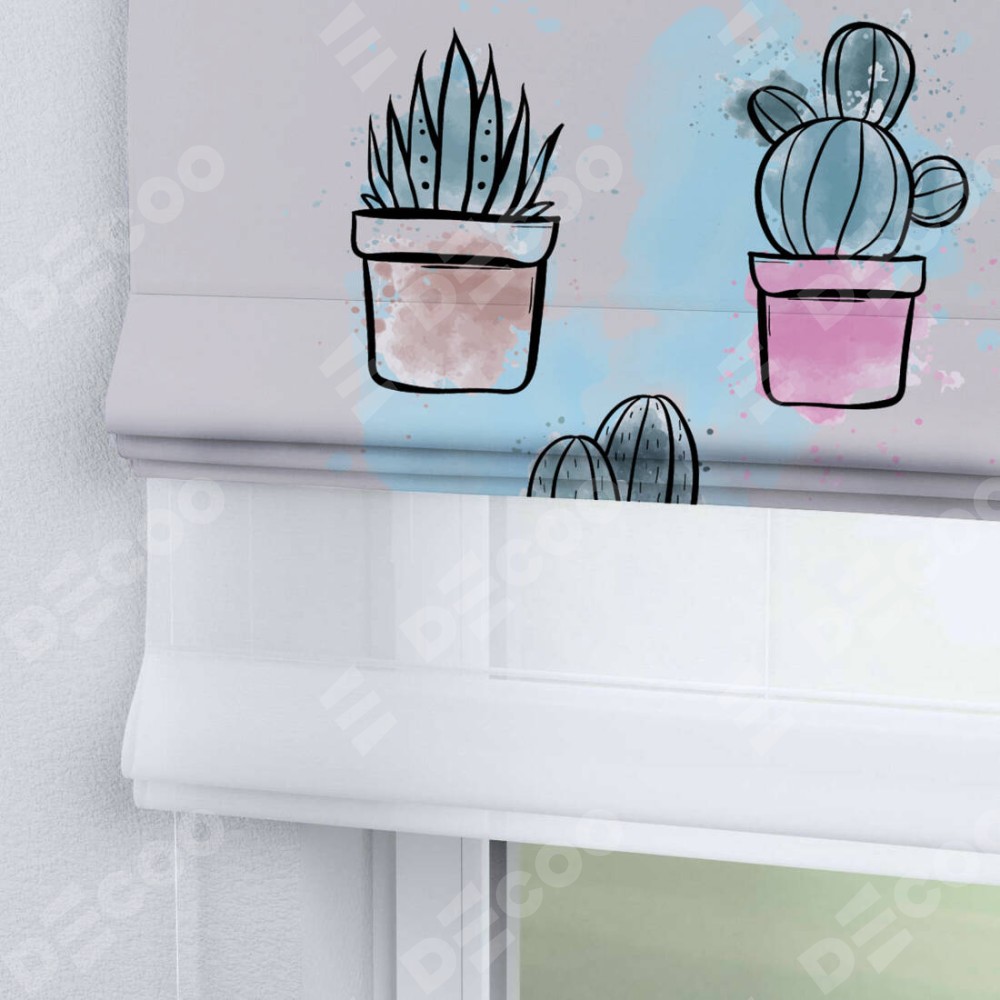 Римская штора день-ночь производителя «Cortin», используется для проёма, пошита из двух полотен, с лицевой блэкаут с нанесением сублимационной печати «Кактусовая оранжерея», вторая ткань тюль (по стандарту комплектуется тюль белого цвета артикул V-01). Имеет универсальный механизм и подходит для монтажа: на потолок, на стену и в нишу.