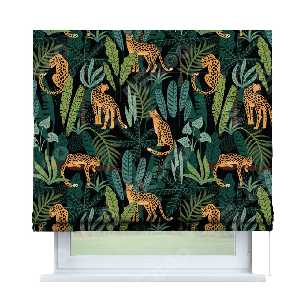 Римская штора производителя «Cortin», используется для проёма, пошита из ткани блэкаут с нанесением сублимационной печати «Леопарды в джунглях». Имеет универсальный механизм и подходит для монтажа: на потолок, на стену и в нишу.